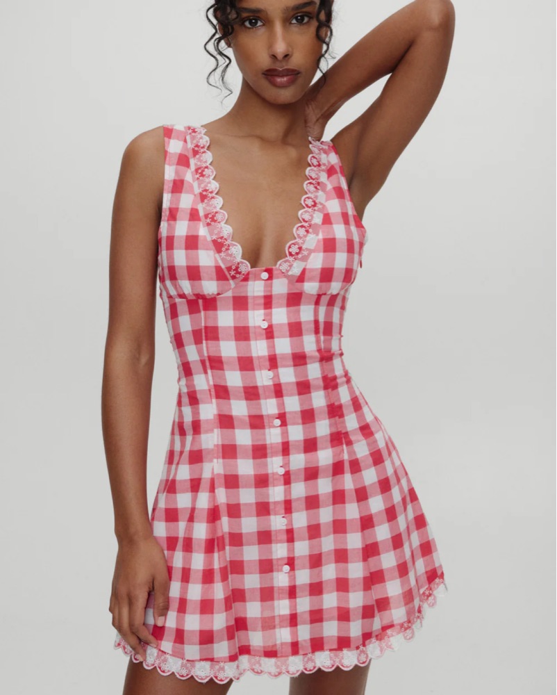 Frankie’s Bikini X Bella Hadid Farm Mini Dress in Malibu Picnic, insanely flattering, cinches in waist from back fits xs-m because of back stretch capacity