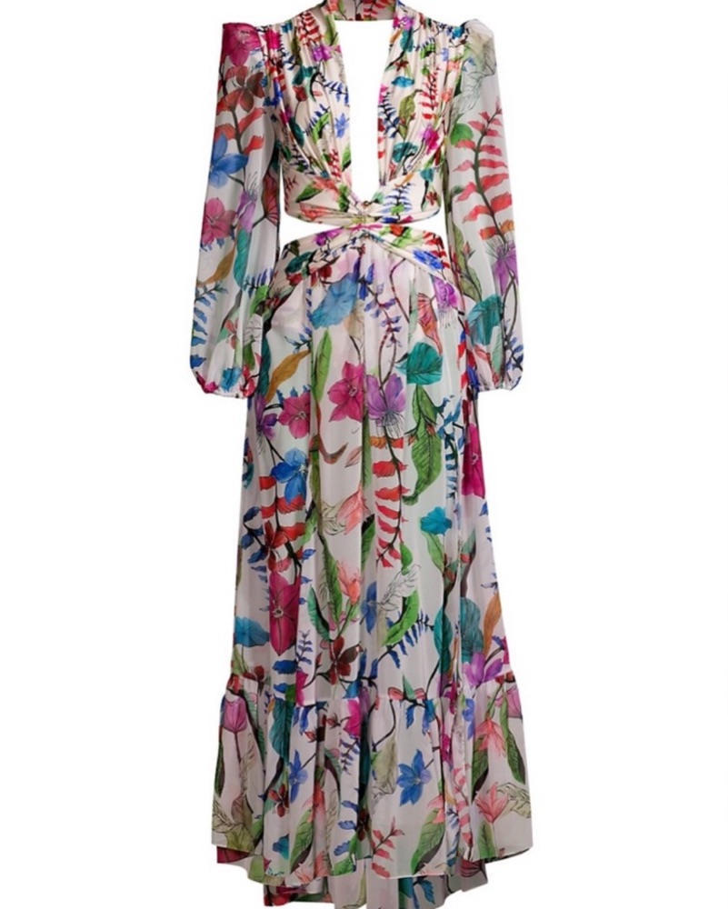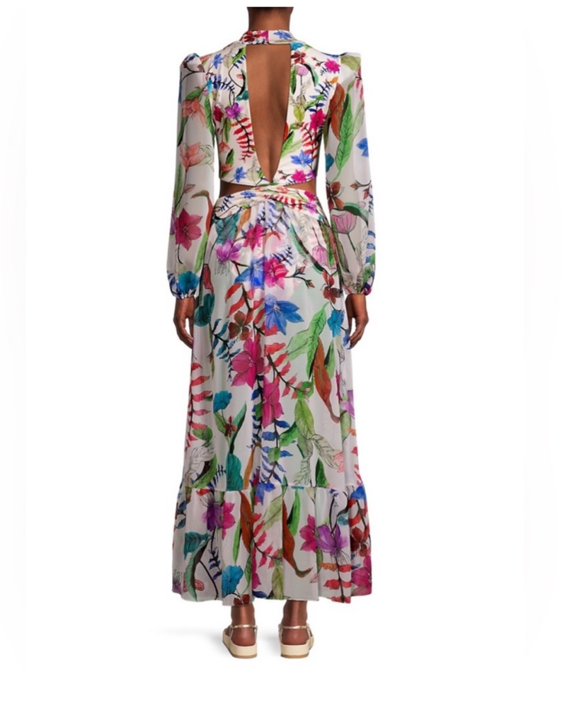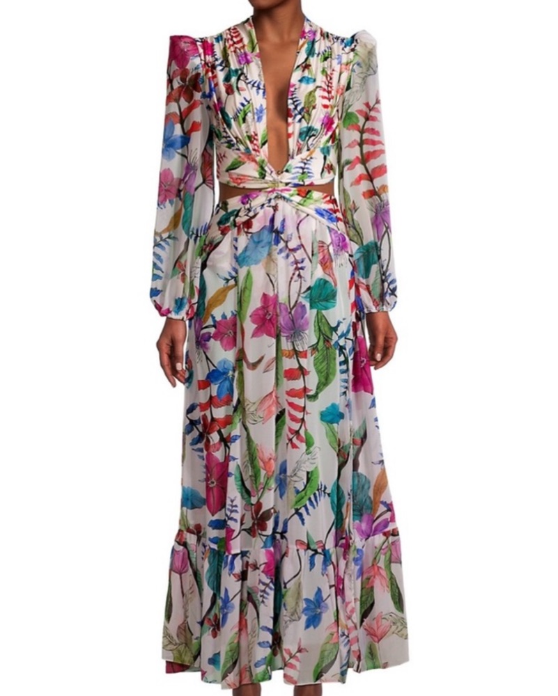 This eye-catching maxi dress is perfect for any summer event or vacation. The bold floral print and flowing silhouette create a stunning, statement-making look.