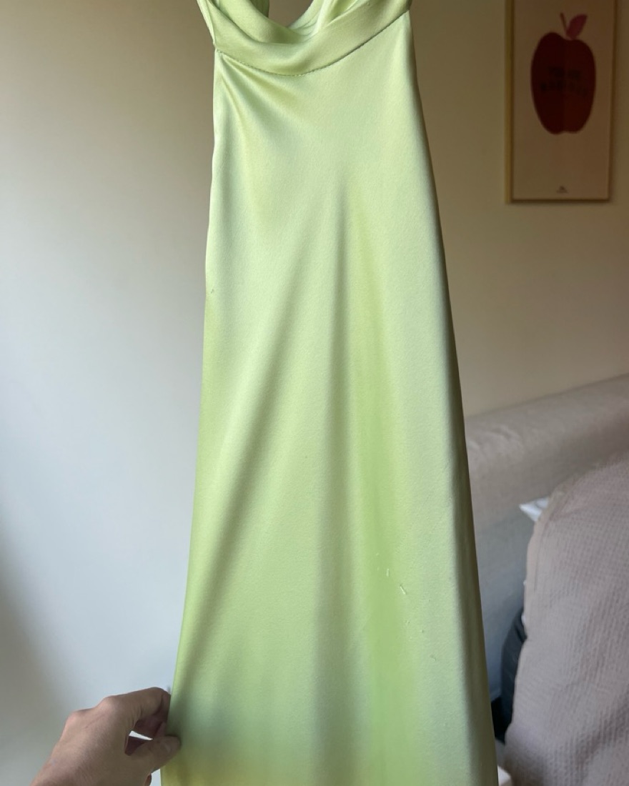 gorgeous silky backless dress!! love the color green :) perfect for a wedding! A few small snags on the front, but nothing extremely noticeable, especially in photos!