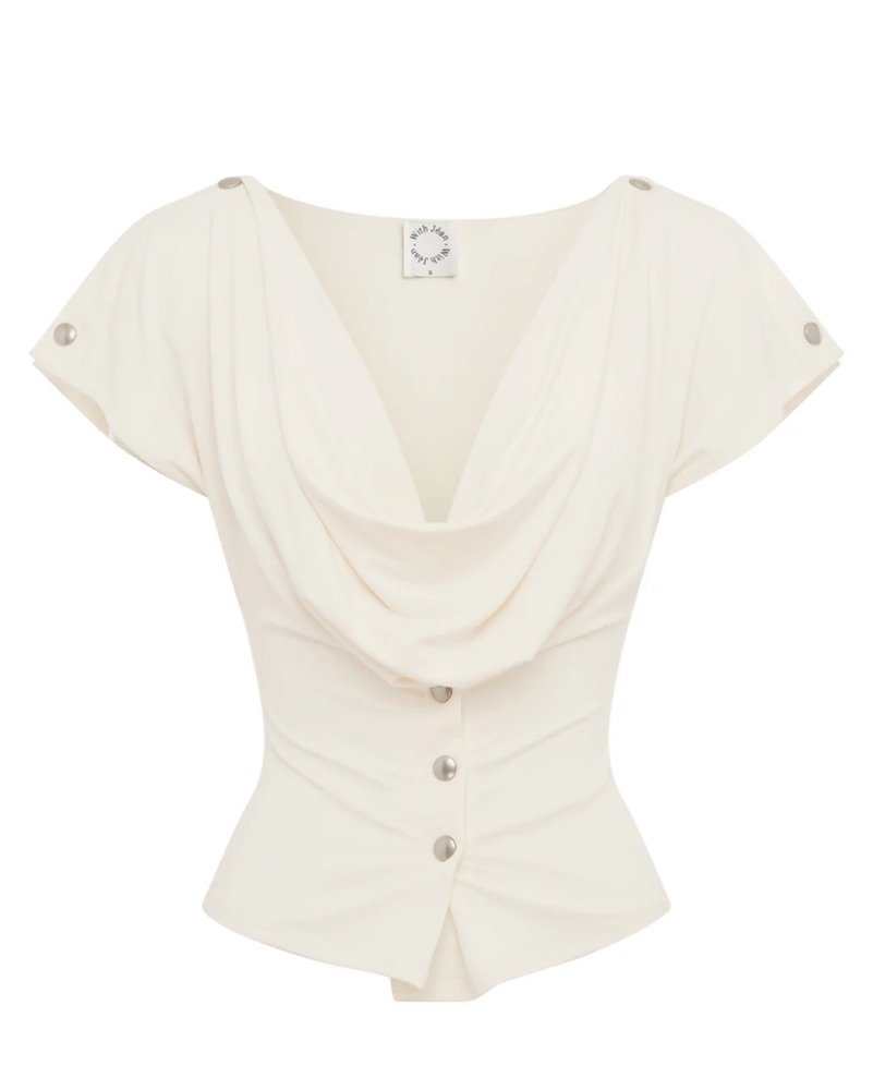 SO cute viral sienna top. Can be worn multiple ways. It is a fitted, cowl neck top featuring button-up cap sleeves and a button-up front closure. Slim fit