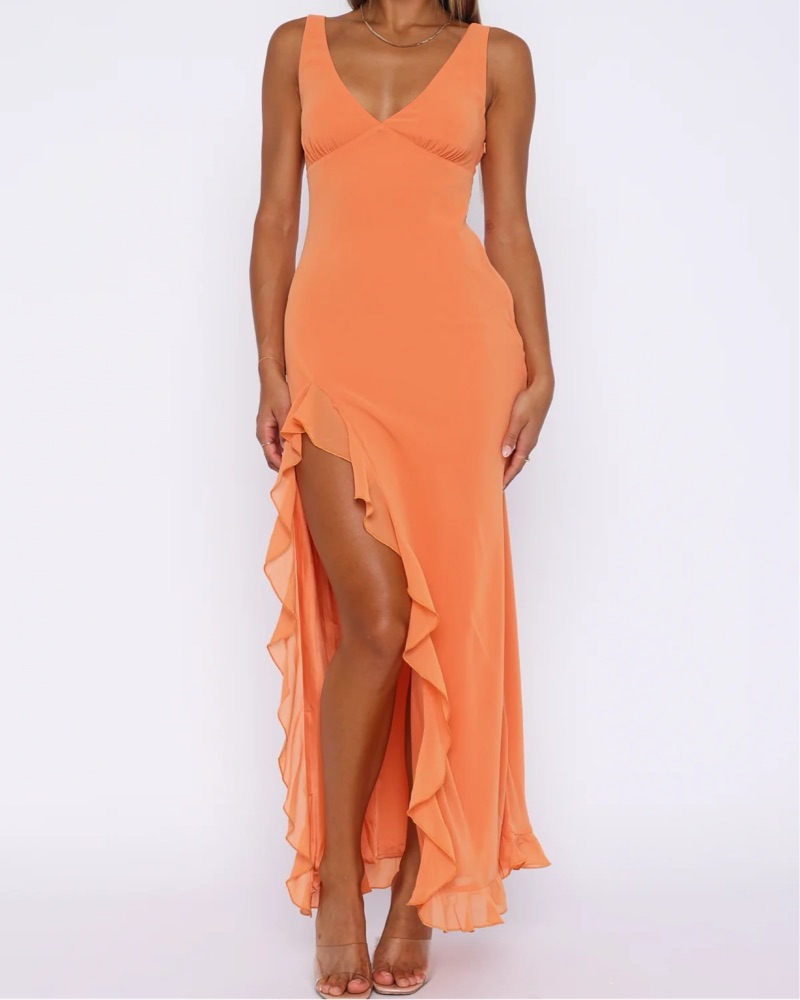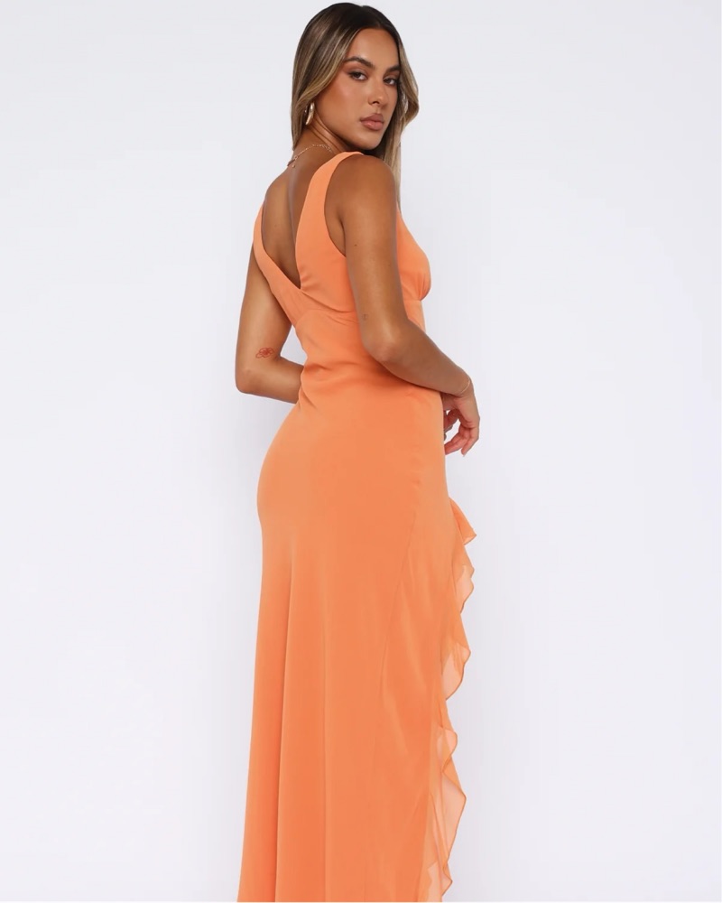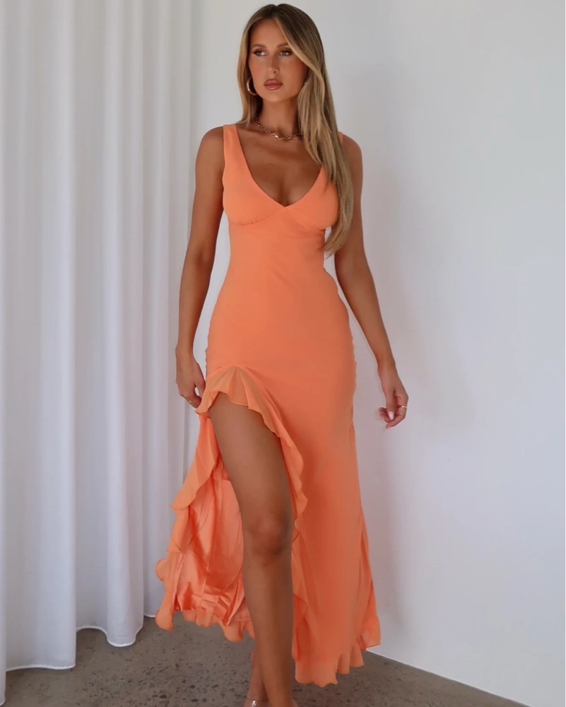 White Fox Tell Me Everything Maxi Dress Melon. You don’t want to stay into with this dress! Features a plunge neckline, thick straps, fill drop hem, invisible zipper on the side and lined fabric. Complete the look with clear heels and gold accessories for a look that is sure to turn heads!