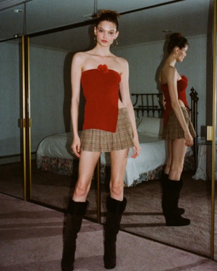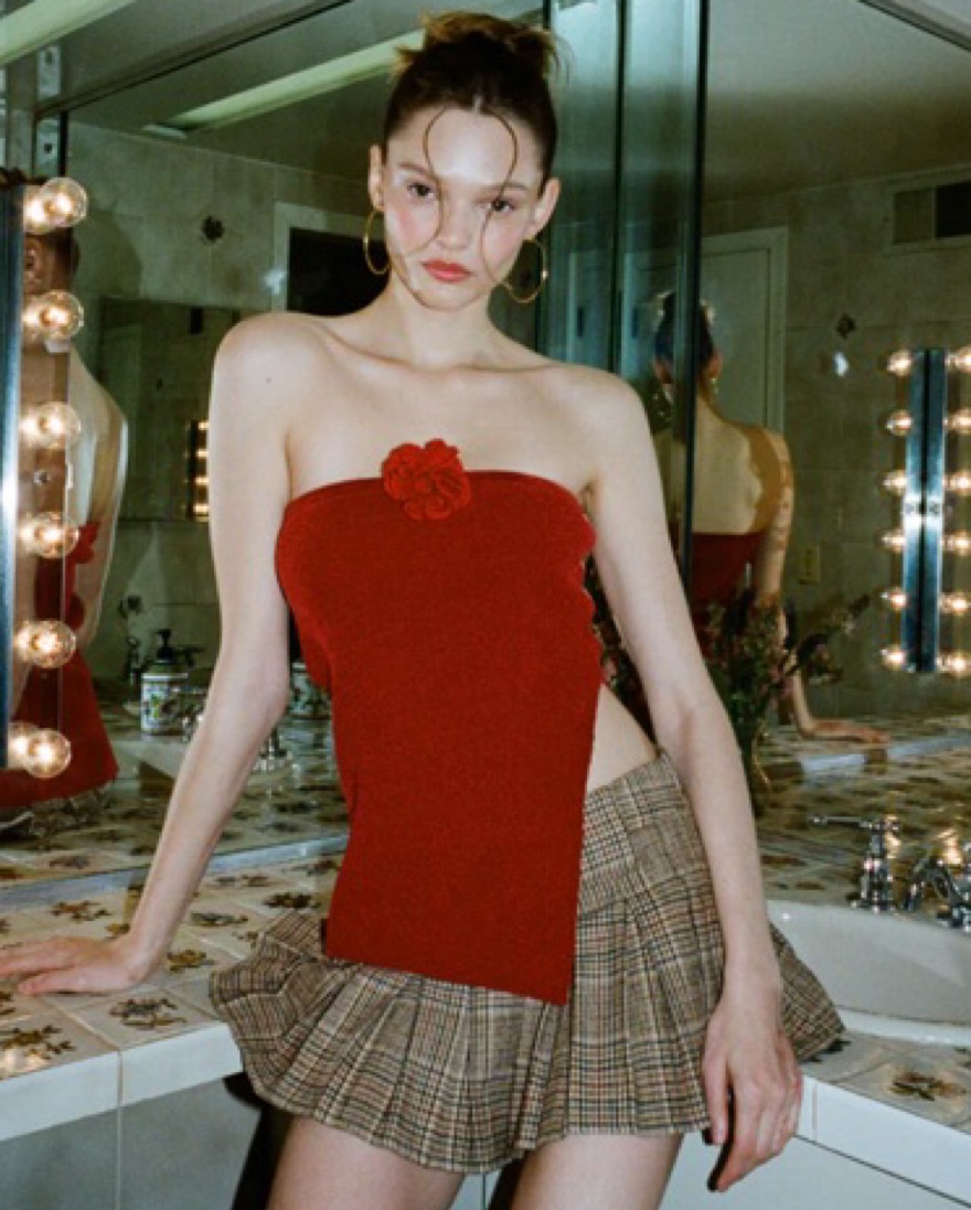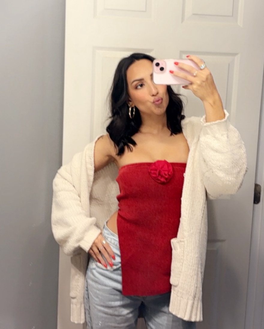Red Rosette With Jean strapless top