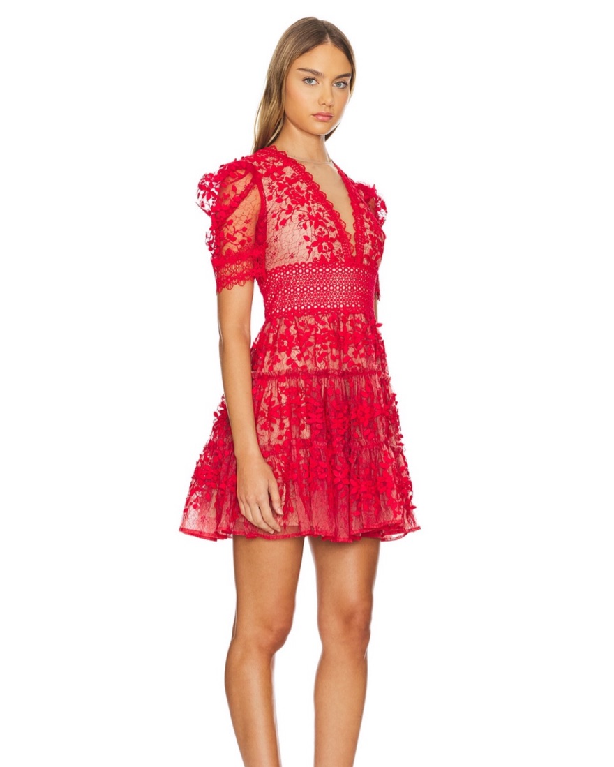 Bronx & Banco Megan Mini Dress in Red with lace and floral embellishment. Holiday dress. Christmas dress. Must dry clean before returning.