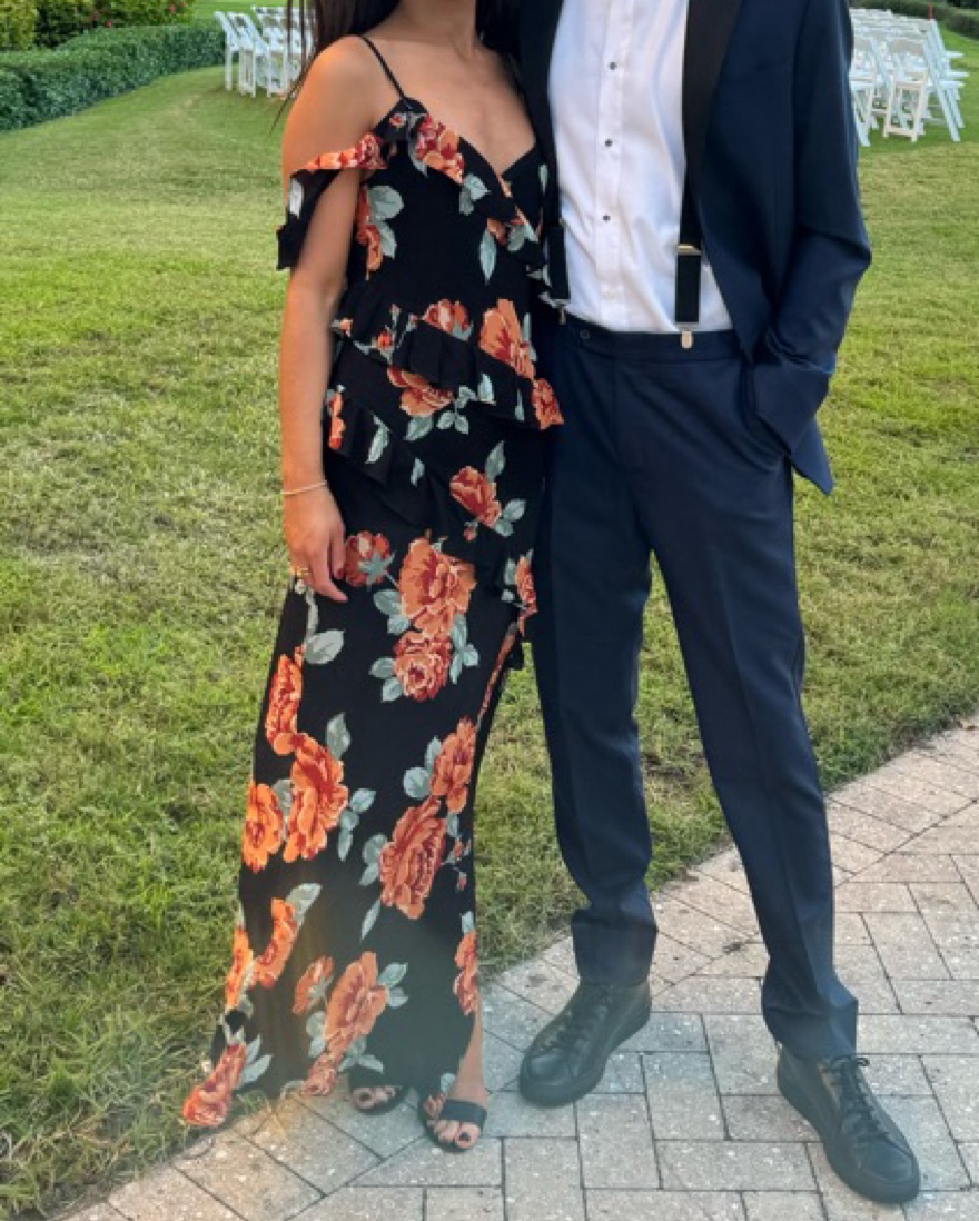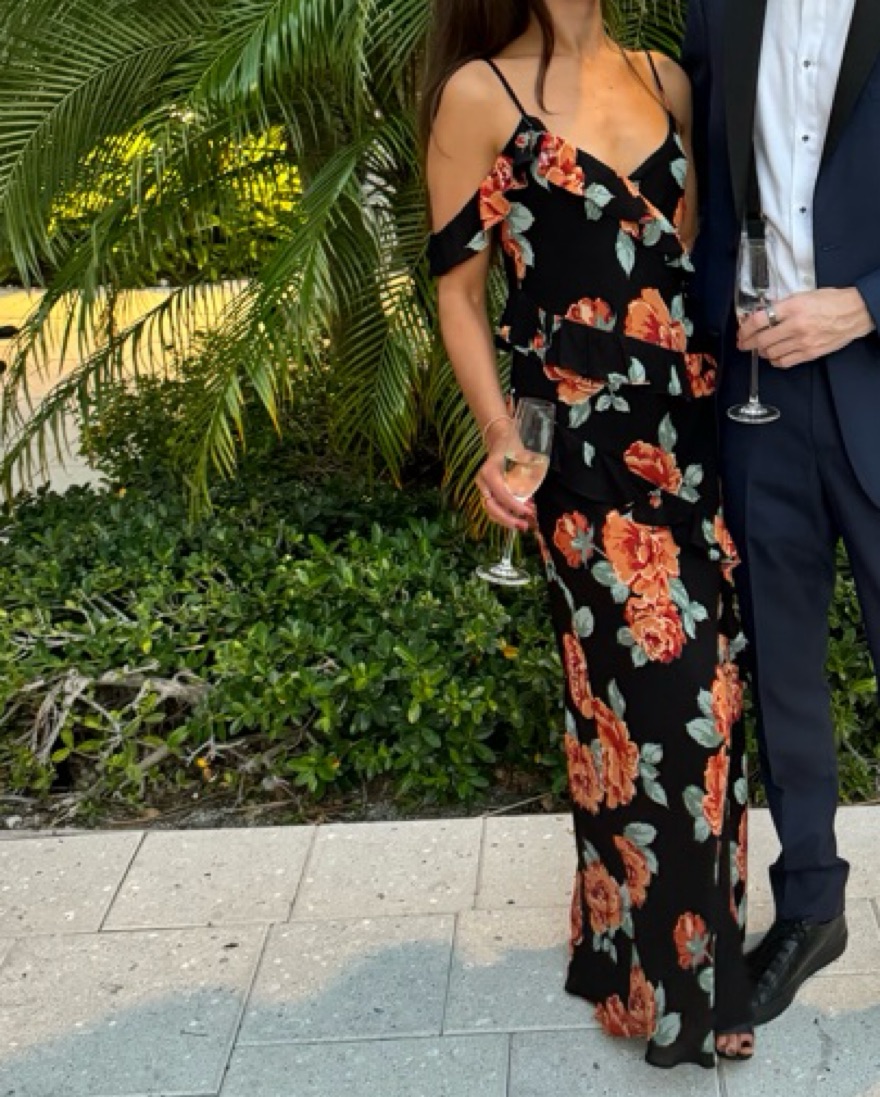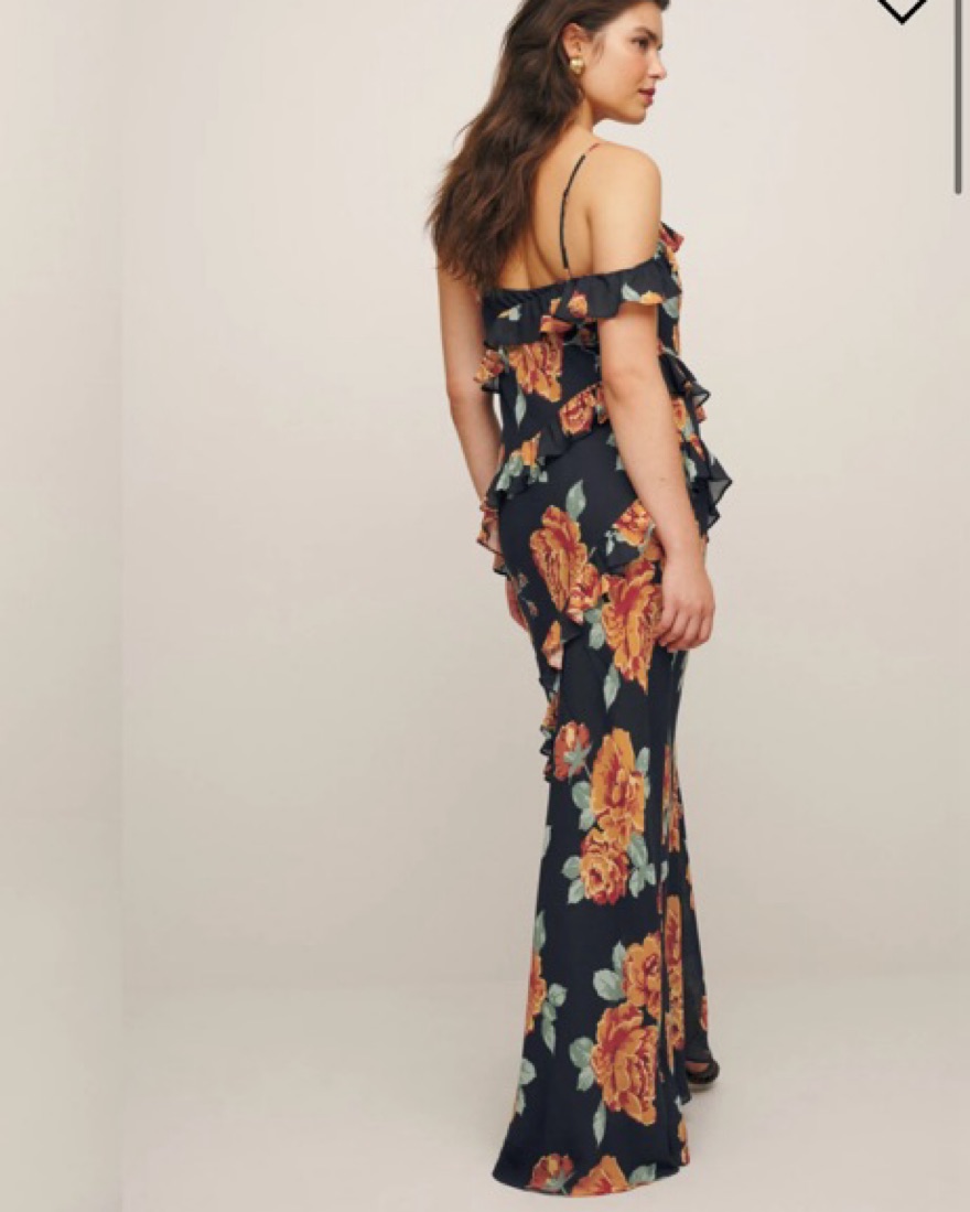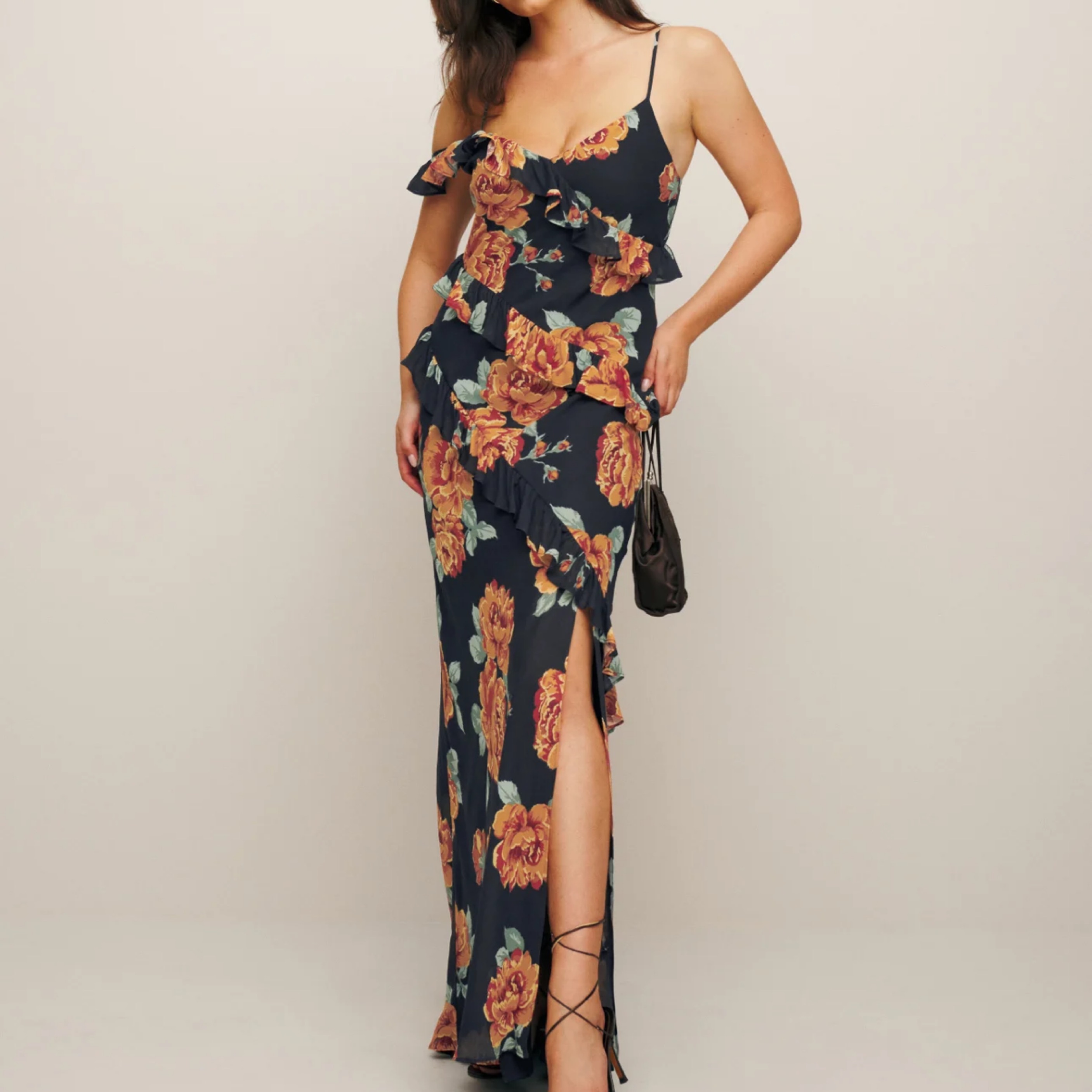 Reformation Elysia Dress, black with floral pattern. Floor length, side slit, perfect for weddings or special events!