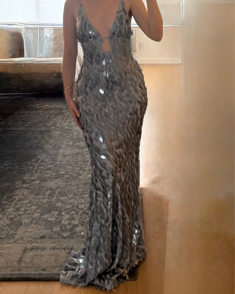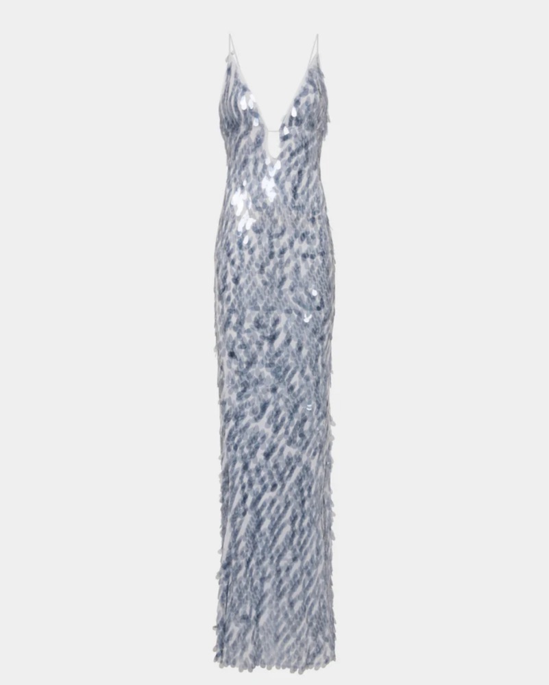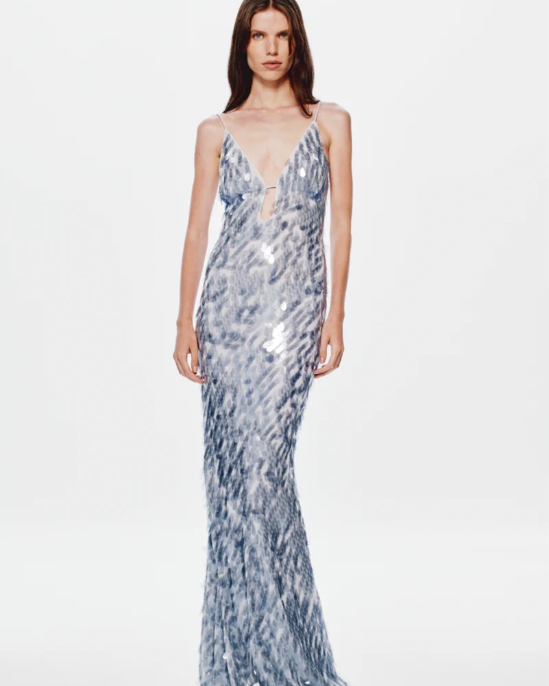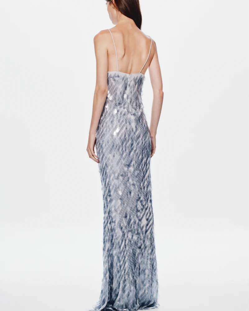 Misha sapphire sequin gala dress in blue/gray. Teardrop sequins. Never worn, size XS fits me (5’2, 25” waist) but is long! Super comfortable and has a little bit of stretch.