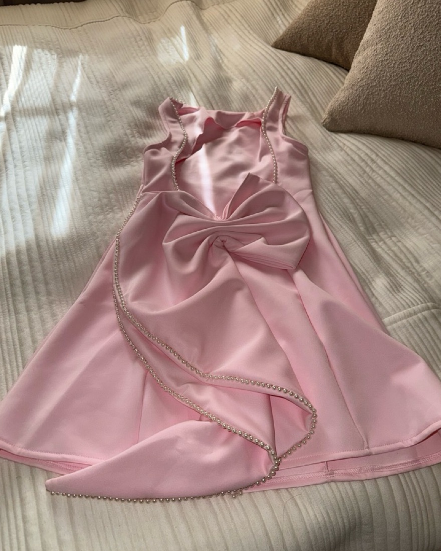 This stunning pink dress is perfect for a formal event or special occasion. The elegant bow detail adds a touch of femininity and sophistication.