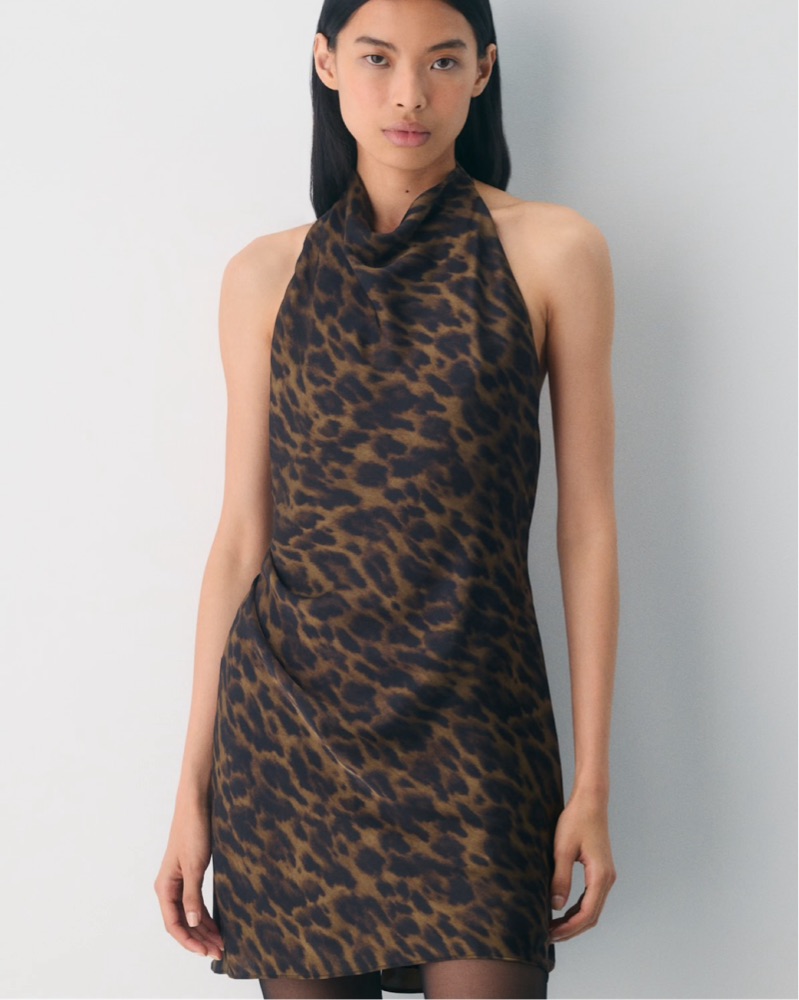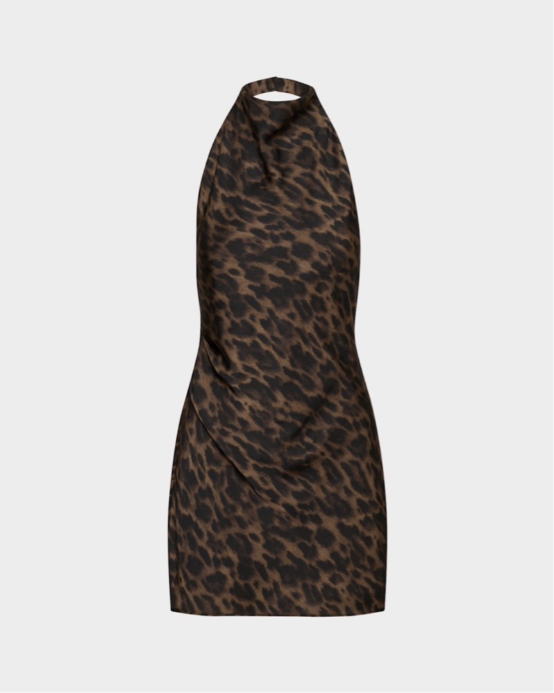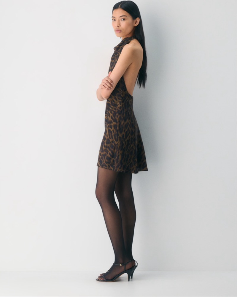 This is a halter mini dress with an open back and a bias cut that drapes beautifully on the body. It's cut from drapey double-faced satin with a soft sheen and luxurious next-to-skin feel.