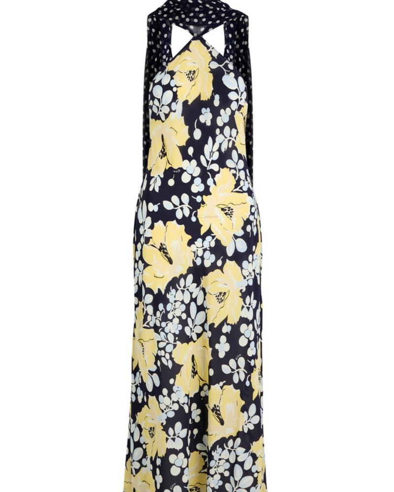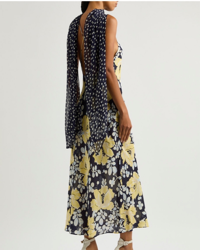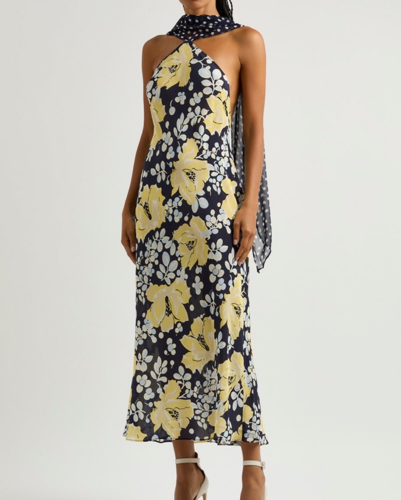 Dry Cleaning included in cost! Very delicate. Any damages will be charged extra. Midi dress features a beautiful floral print in a timeless color palette. Pair it with strappy heels for a chic, sophisticated look perfect for a summer wedding or garden party.