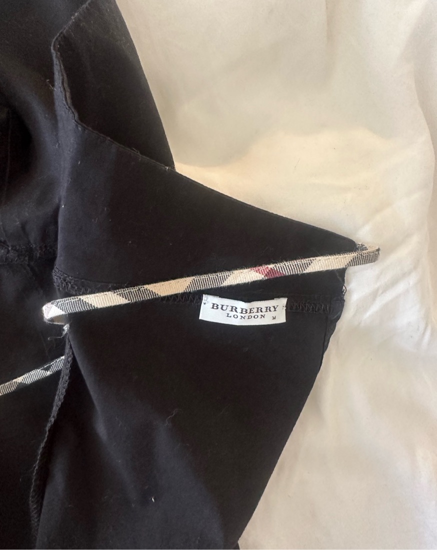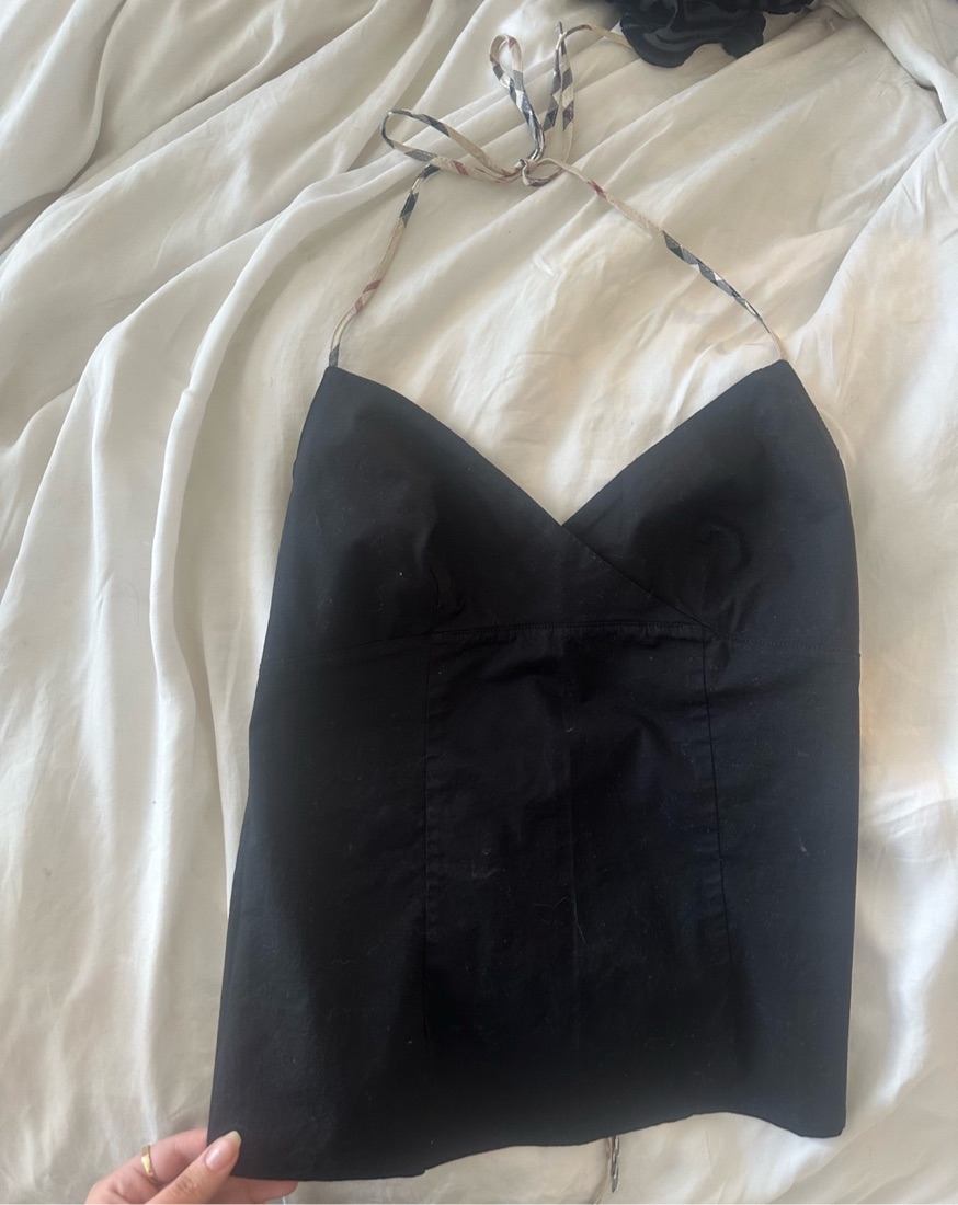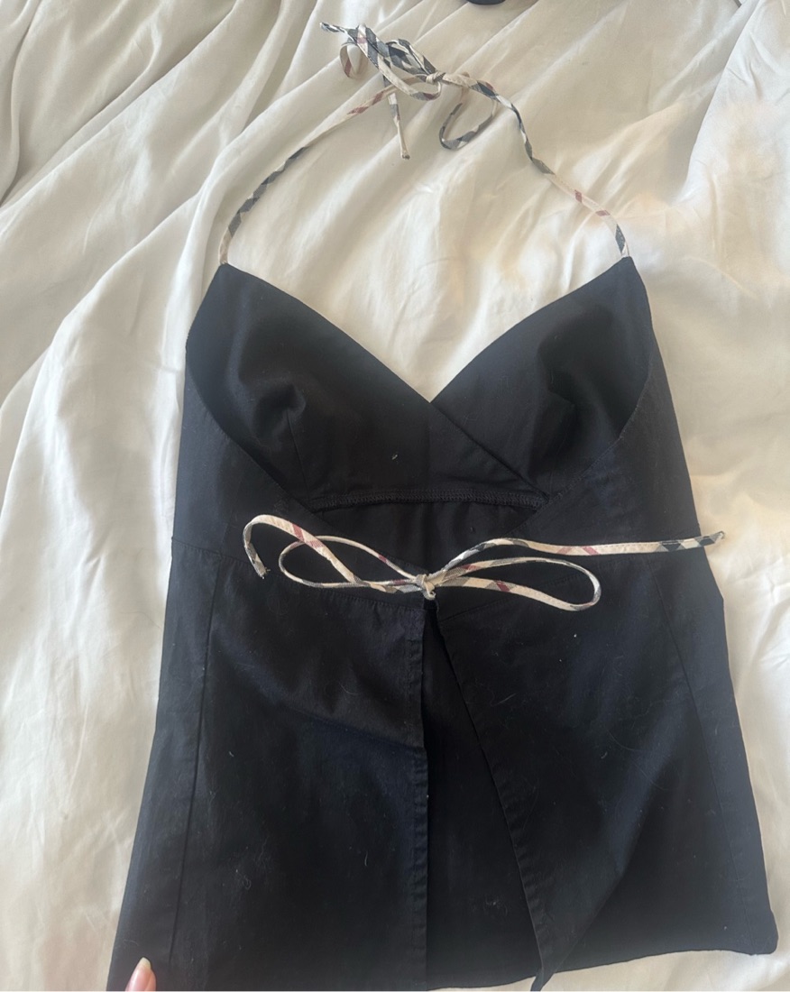 Black halter tank top by Burberry with adjustable ties at halter and back