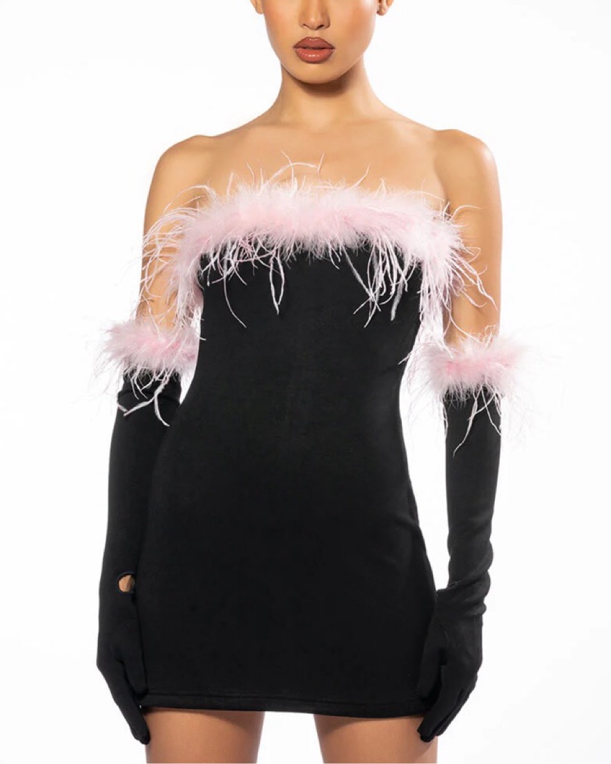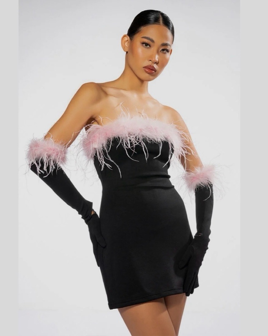 Strapless black dress with pink feather trim! 🩷 Back zipper closure. Gloves included (with easy hand removal *see in last pic*)