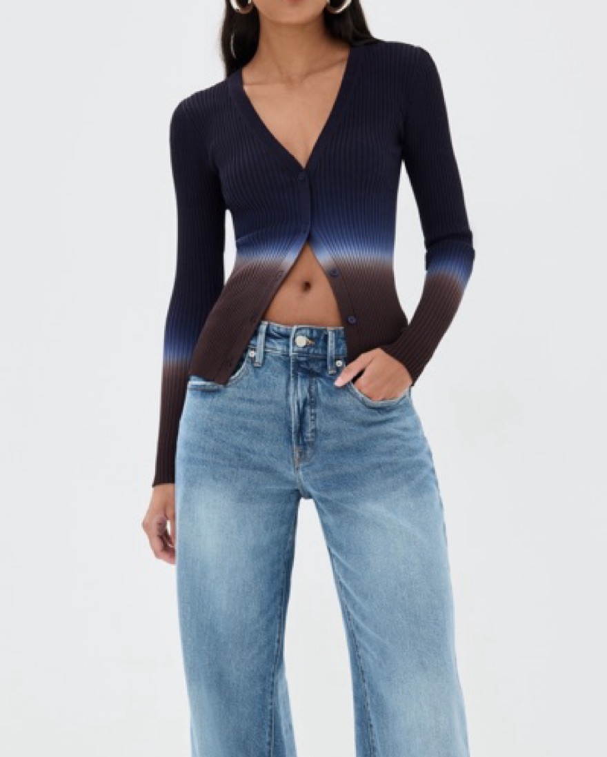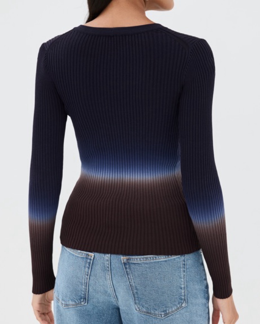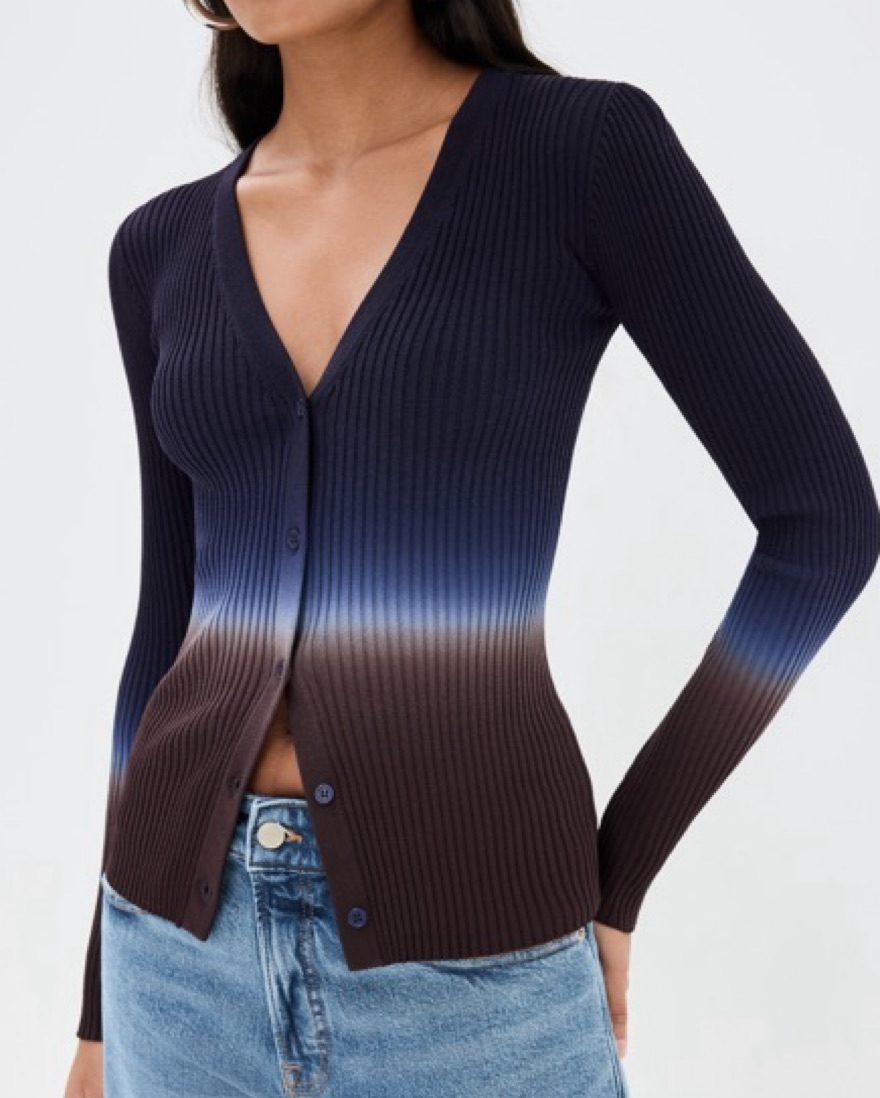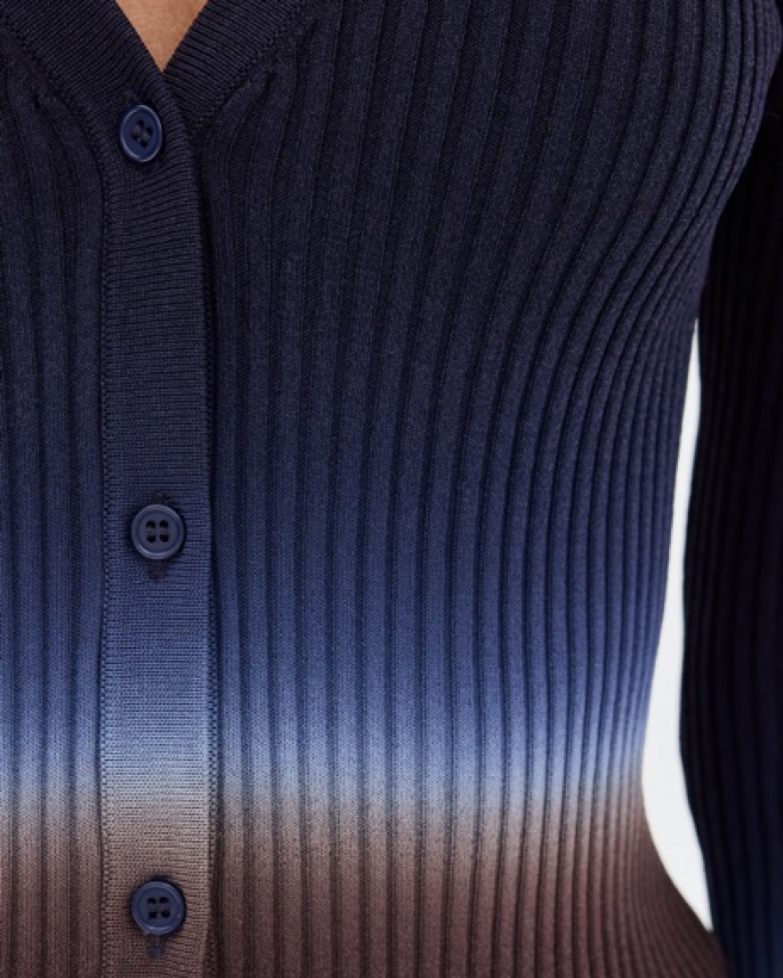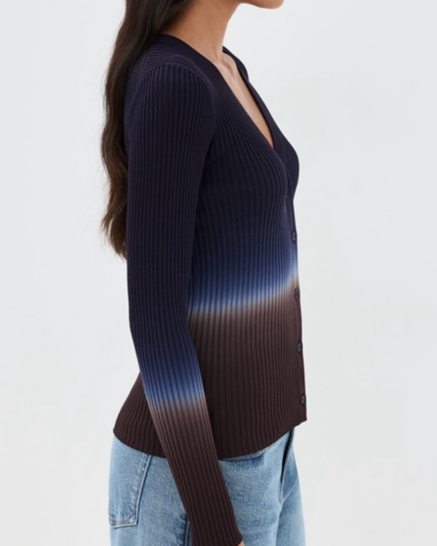 cardigan | blue and brown tie-dye ombre | ribbed knit | v neck