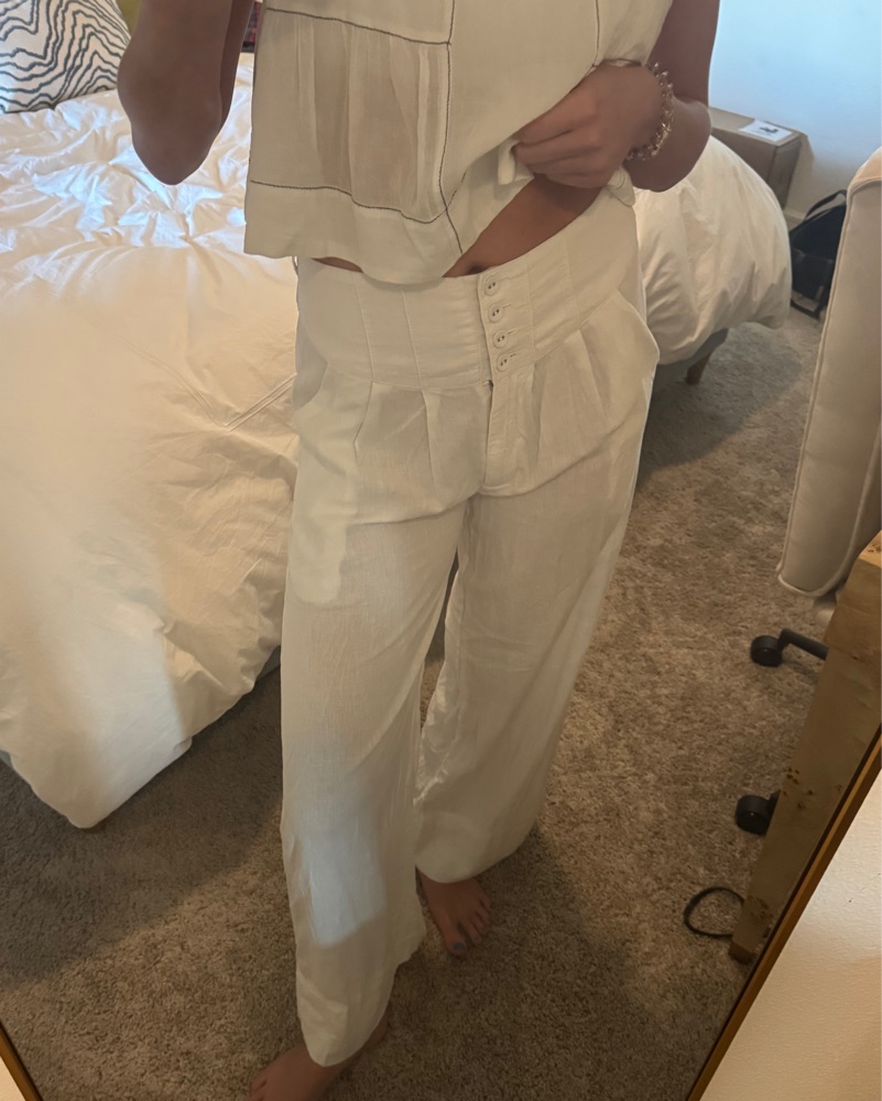 Cute white linen pants with a corset sorta detail at the waist. Super flattering! Perfect for the summer ❤️ fits size small/medium (I typically wear 26-28 in jeans)