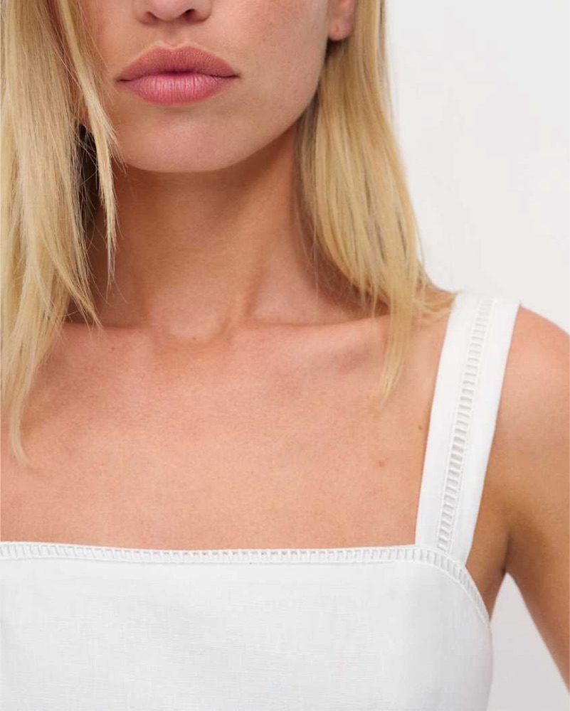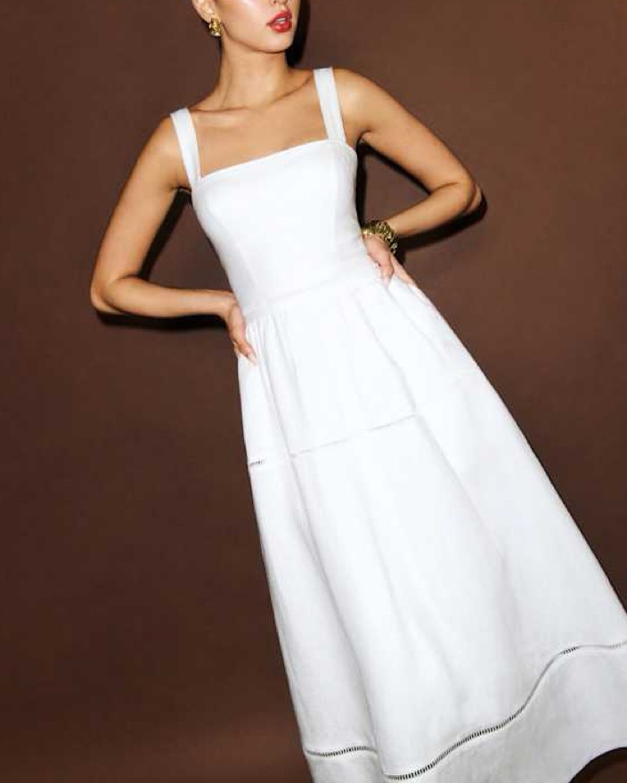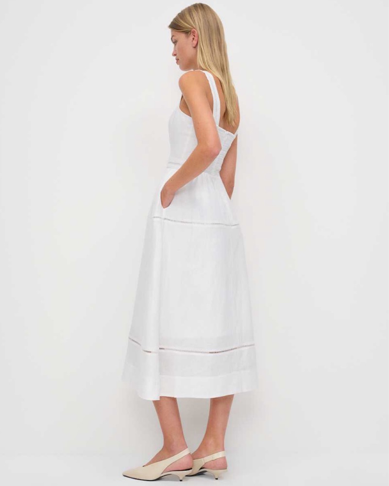 Reformation's Everette midi-dress evokes an airy design, crafted of a light linen adorned with breezy ladder trims. A-line silhouette, features a square neckline, fixed broad shoulder straps, and back smocked panel.