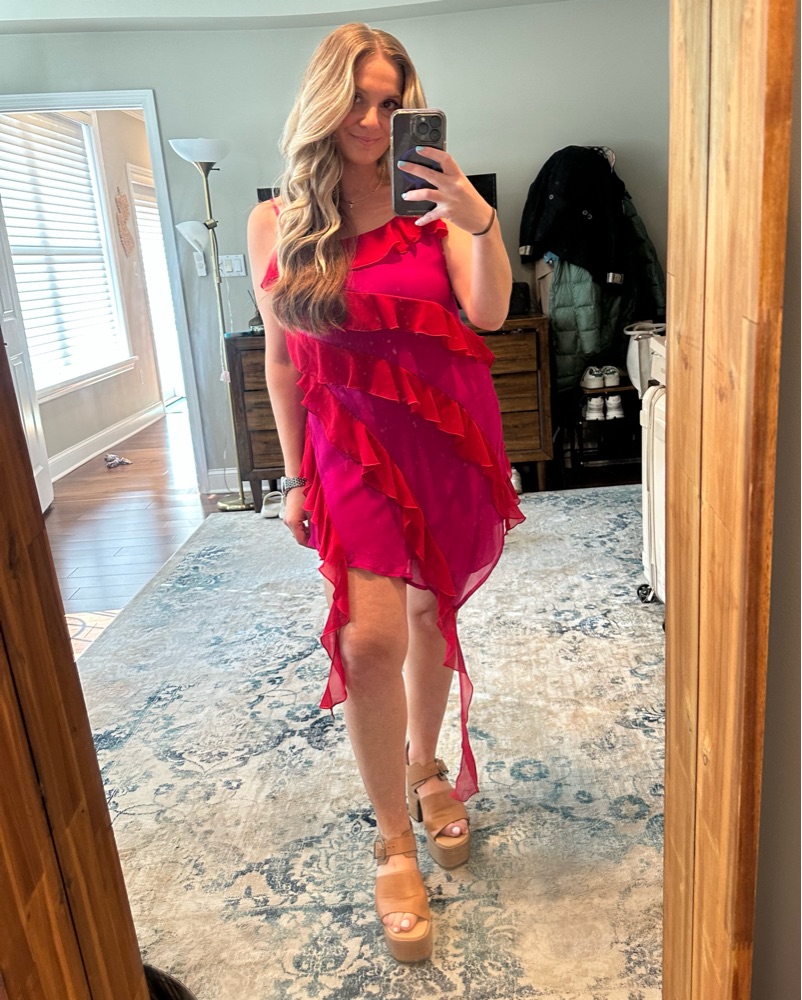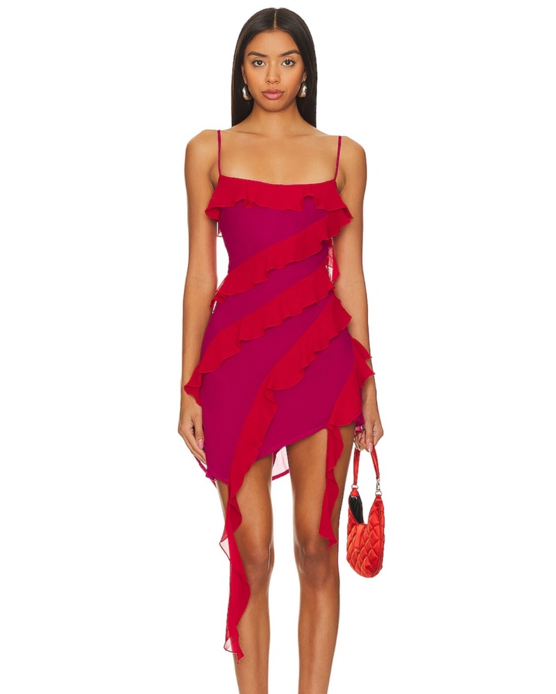 Turn heads in the Lovers and Friends Marisol Mini Dress in Pink & Red. With adjustable shoulder straps and flowy georgette fabric adorned with ruffle trim, it's the perfect color choice for your next party.