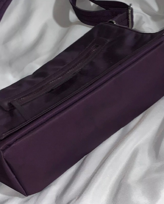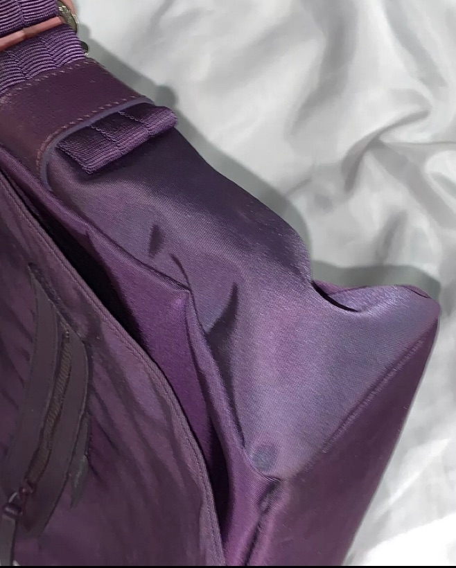 PRE-OWNED CONDITION, one end panel of the bag is a darker purple color which appears to be intentional. Interior of bag is spotlessly clean, exterior shows light wear including small scuffs and scratches, particularly around zipper areas and openings.
