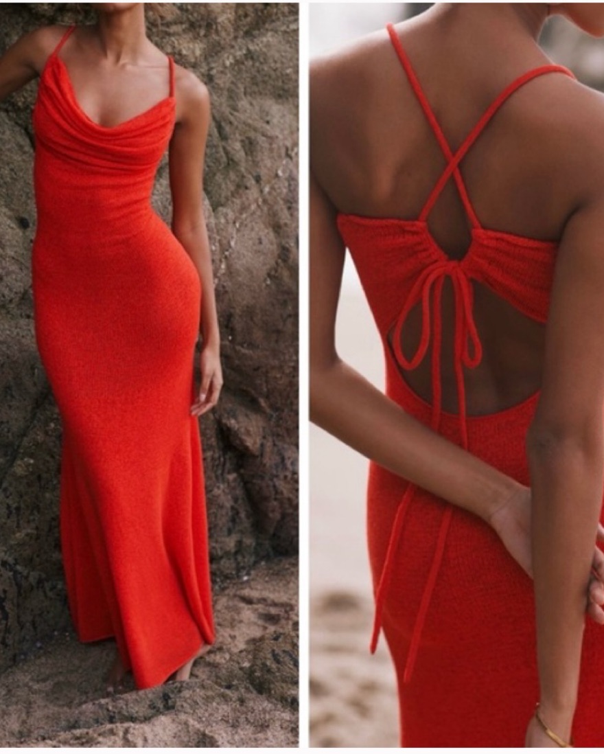Floor length red knit dress from Anthropologie. Open back & cowl neck