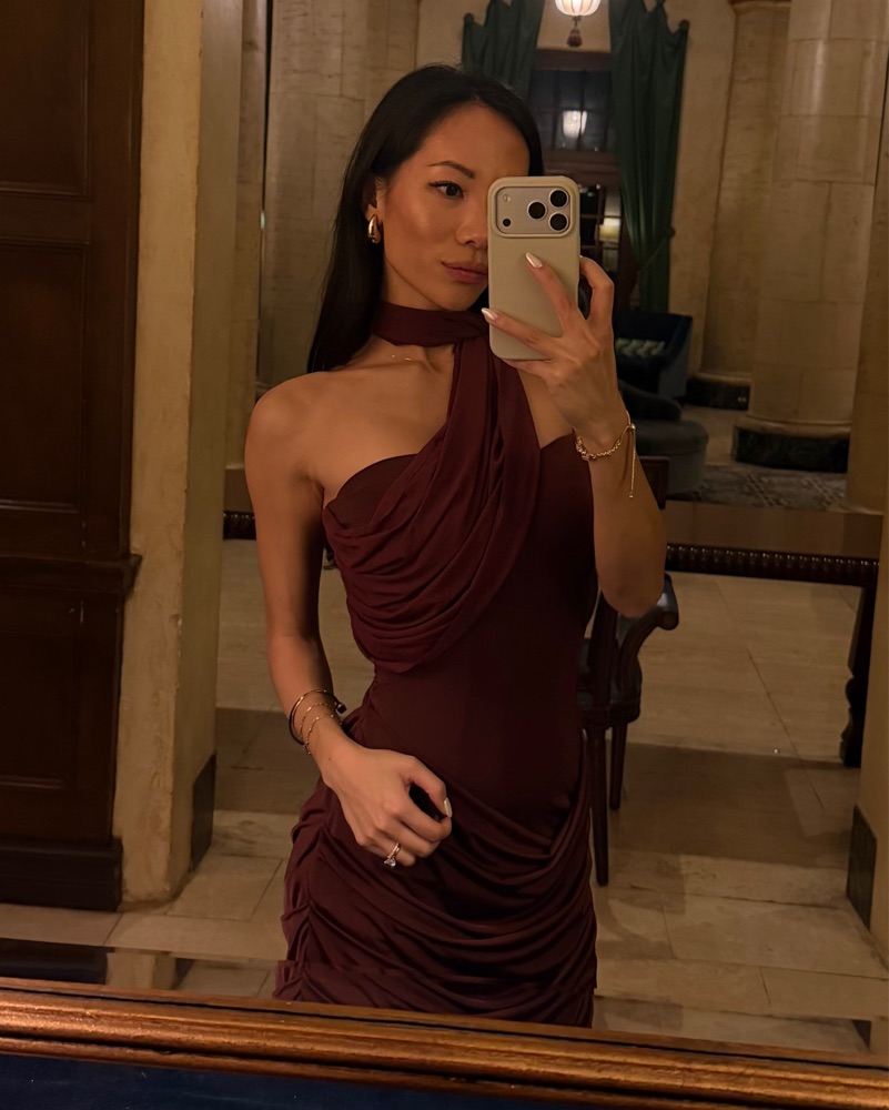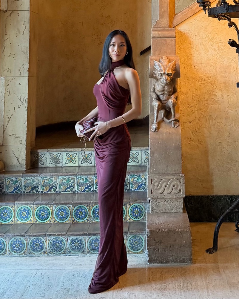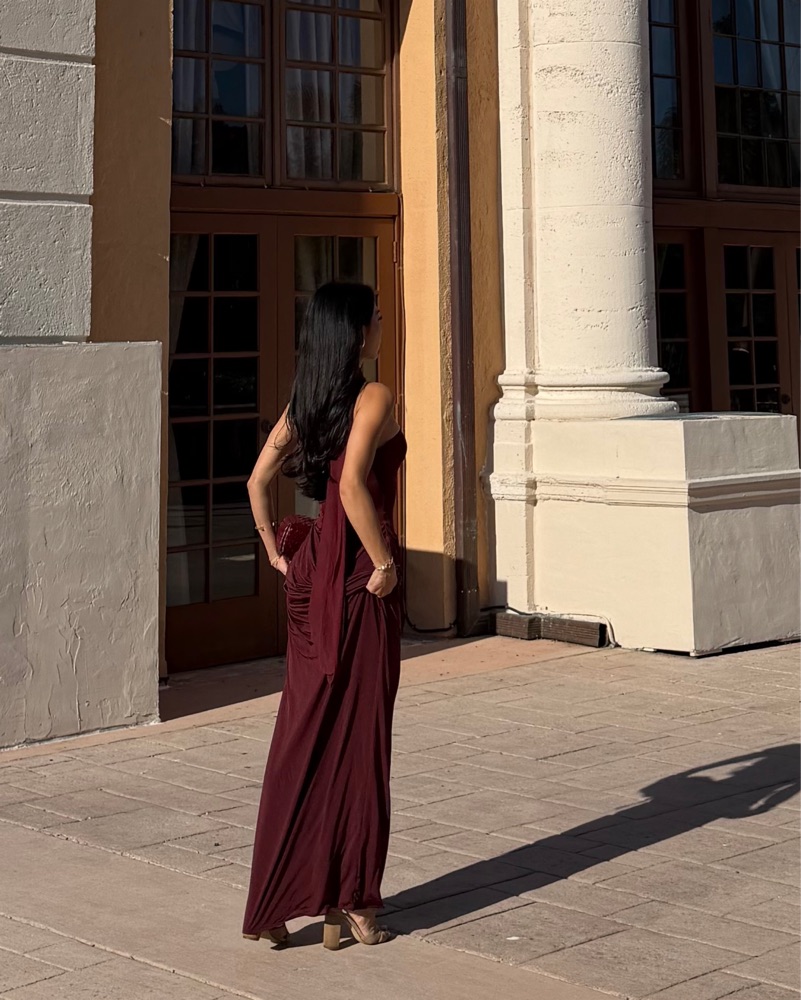 Burgundy Mattea slinky mesh maxi dress with scarf