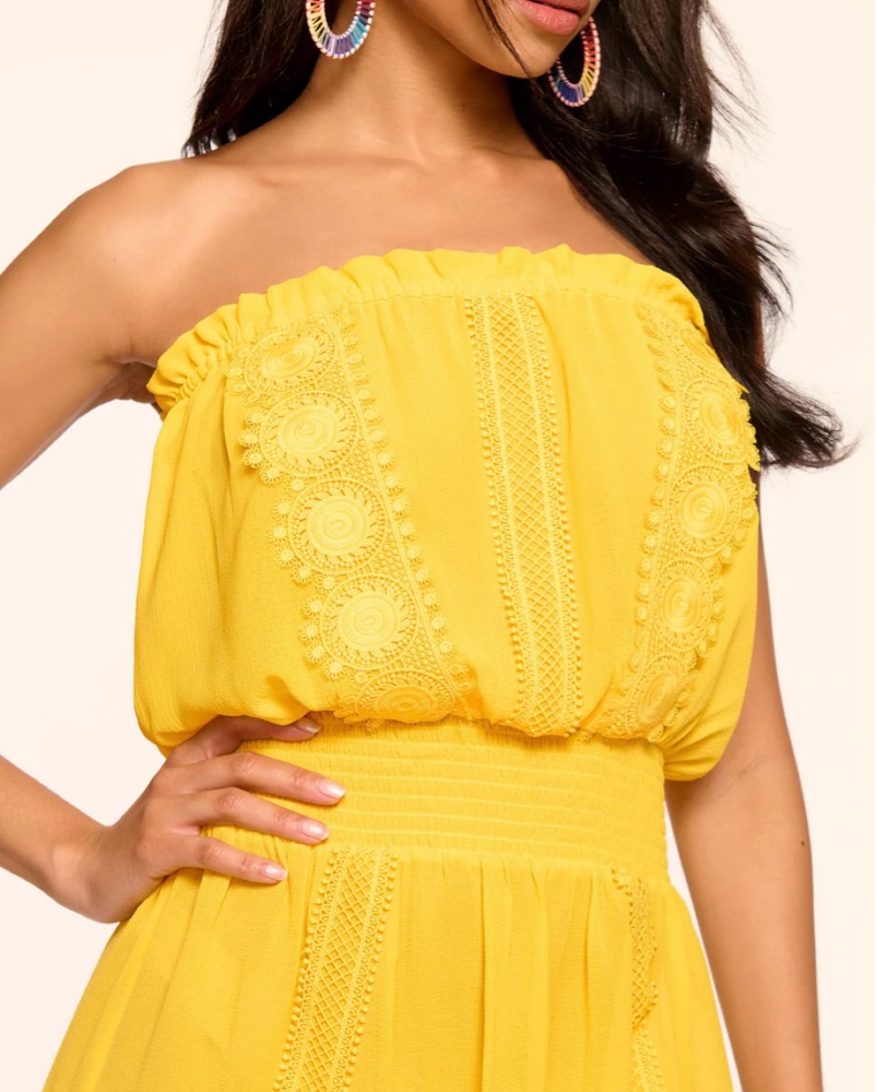 The sun won't be the only thing shining this summer. The Norika showcases a strapless design with a smocked elastic waist and handkerchief hem, perfect for breezy summer outings. Pair it with statement jewelry for elevated styling.