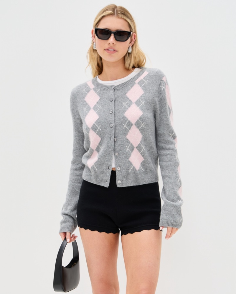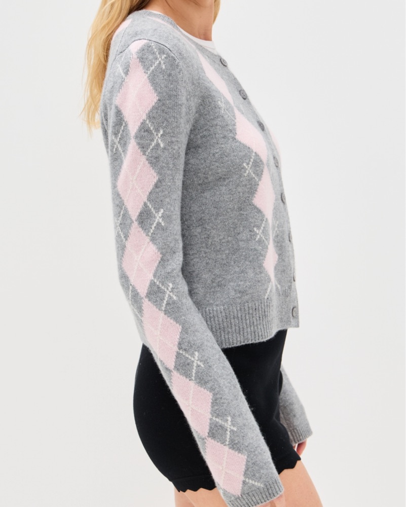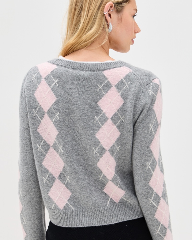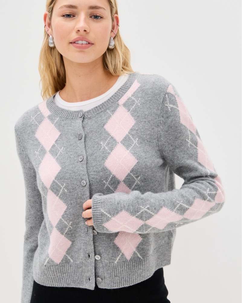 This versatile argyle cardigan can be dressed up or down for any occasion. Wear it with jeans and heels for a chic daytime look or pair it with a mini skirt and booties for a night out. Perfect for us open and fall weather