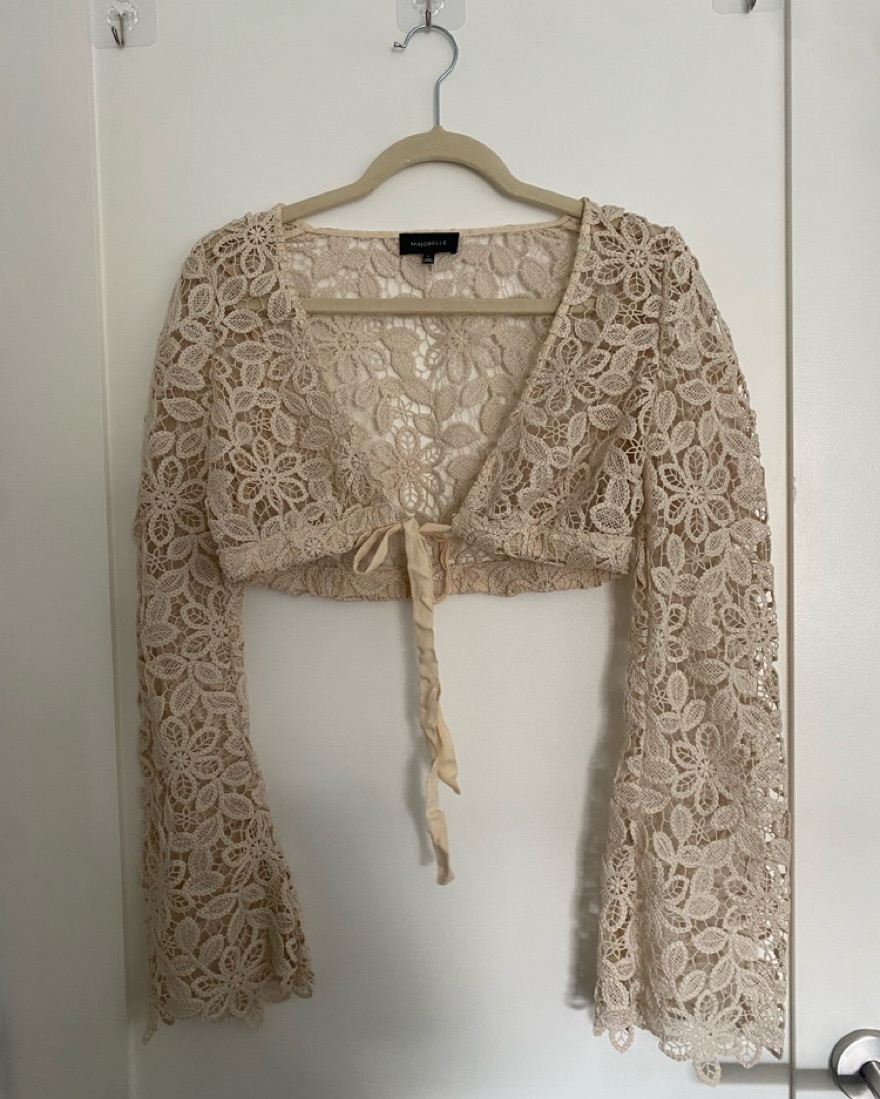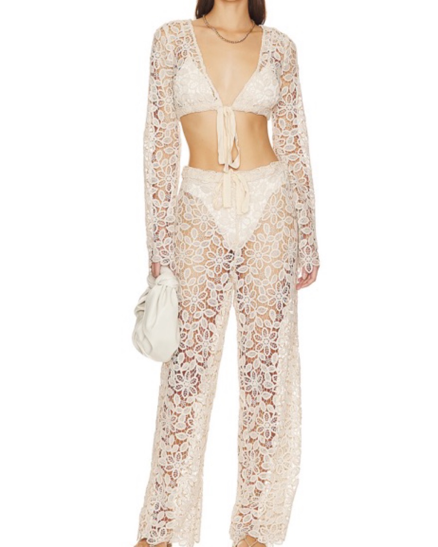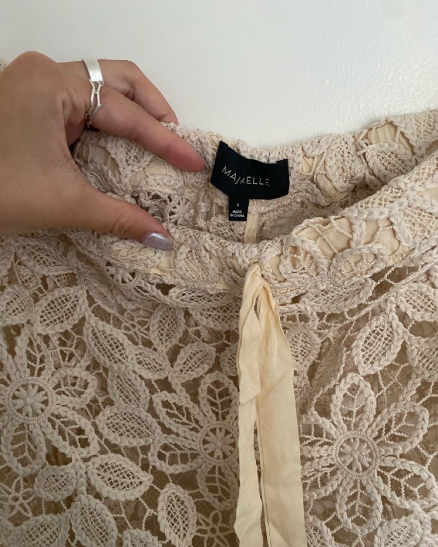 In the color “Santorini Sand.” Open knit fabric cover up. Perfect for a boat day or tropical island vacations!