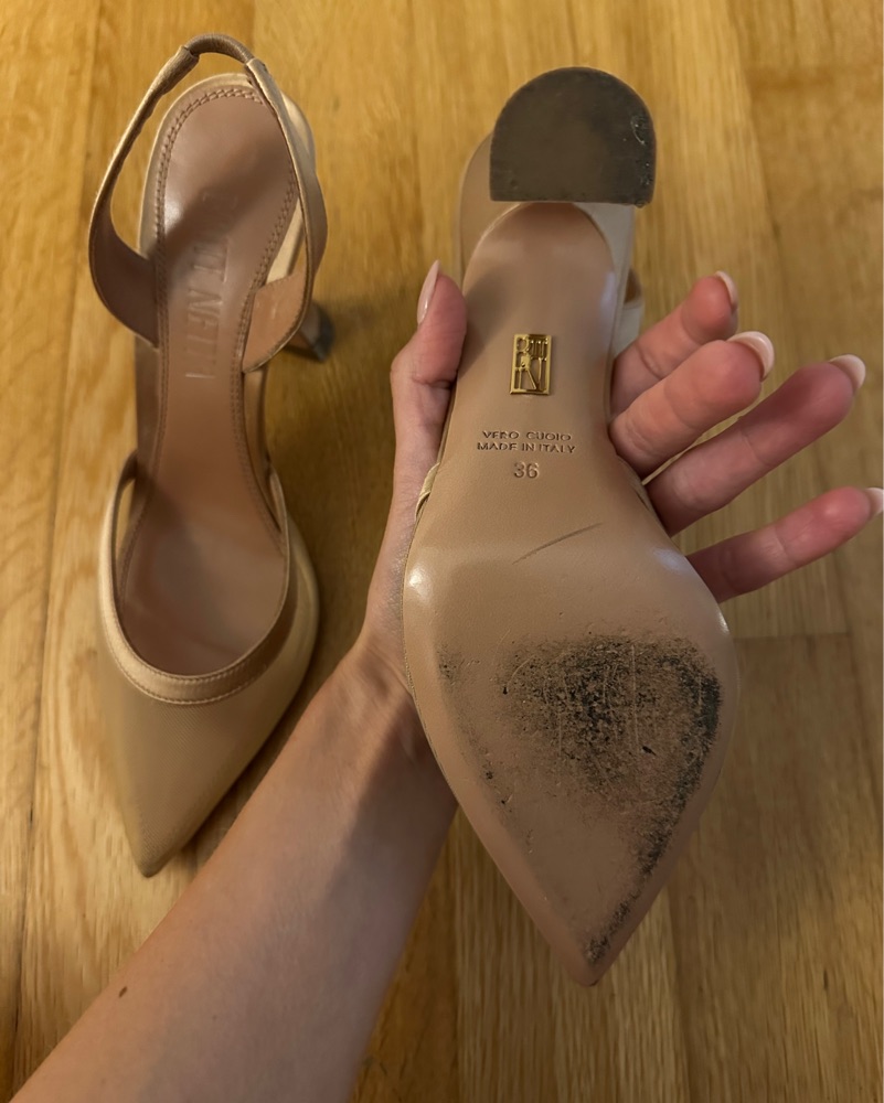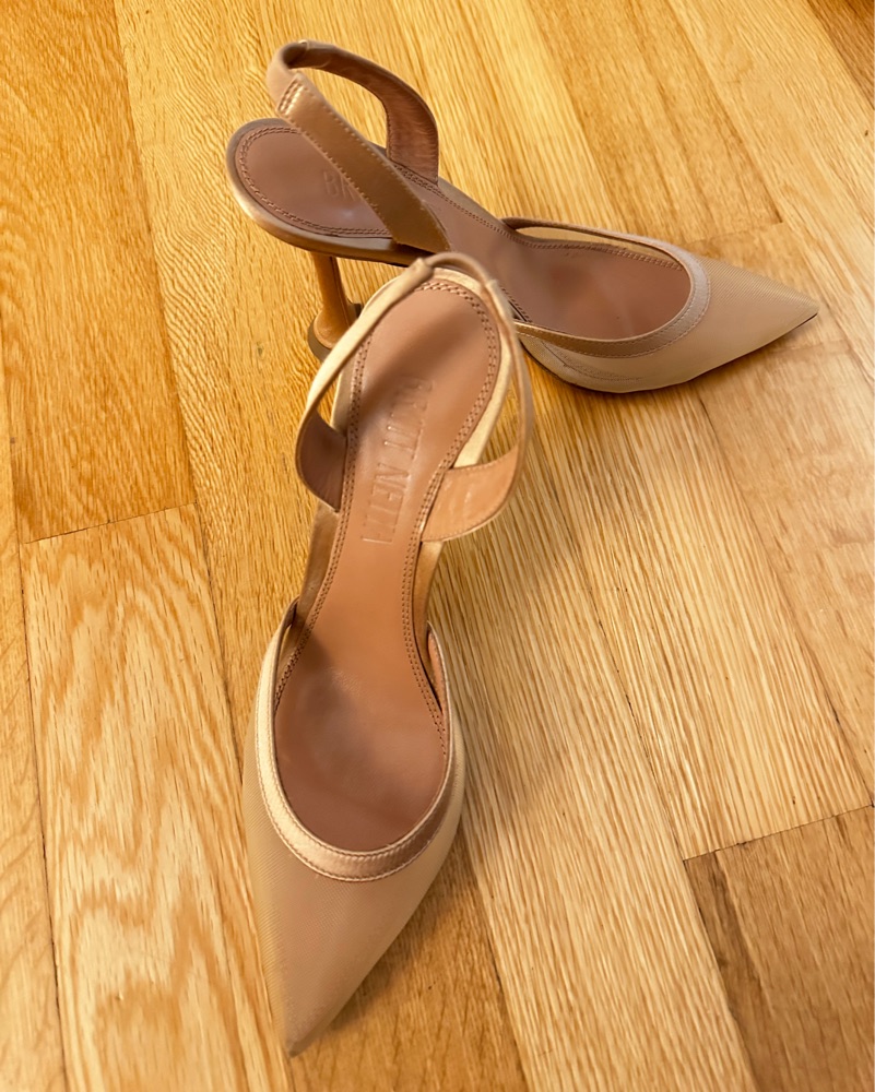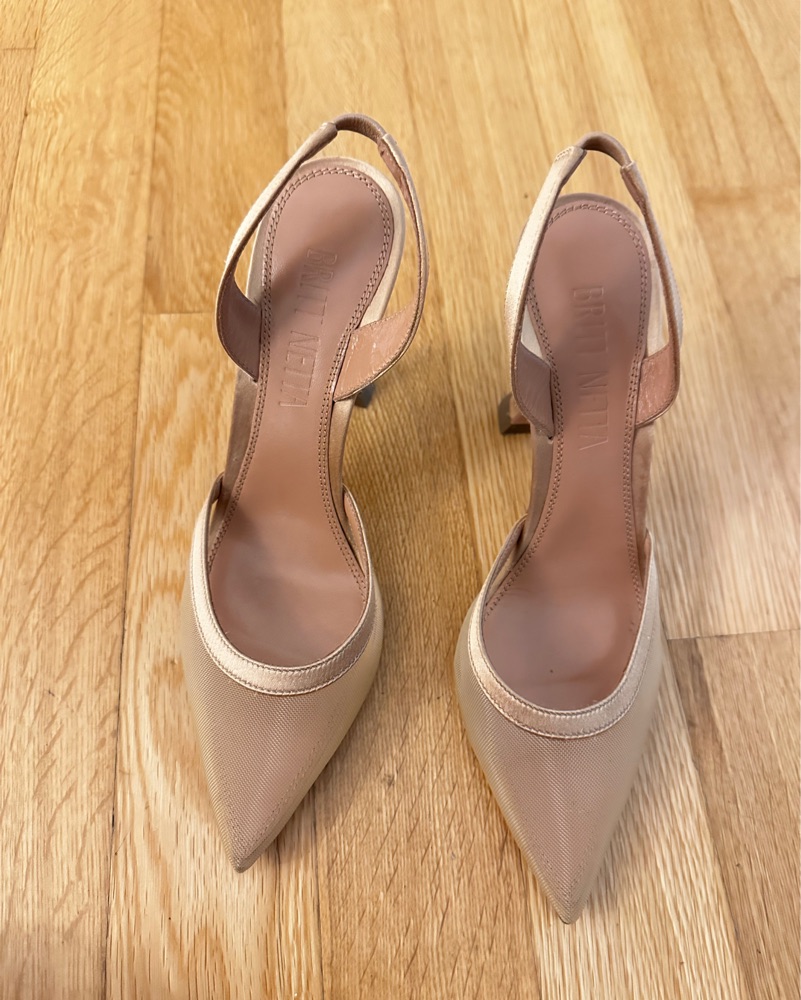 The epitome of modern sophistication, the Esme sandal accentuates its satin-trimmed upper with fine fishnet mesh for a see-through effect. The slingback's pointed toe and signature Martini heel reflect architectural design.