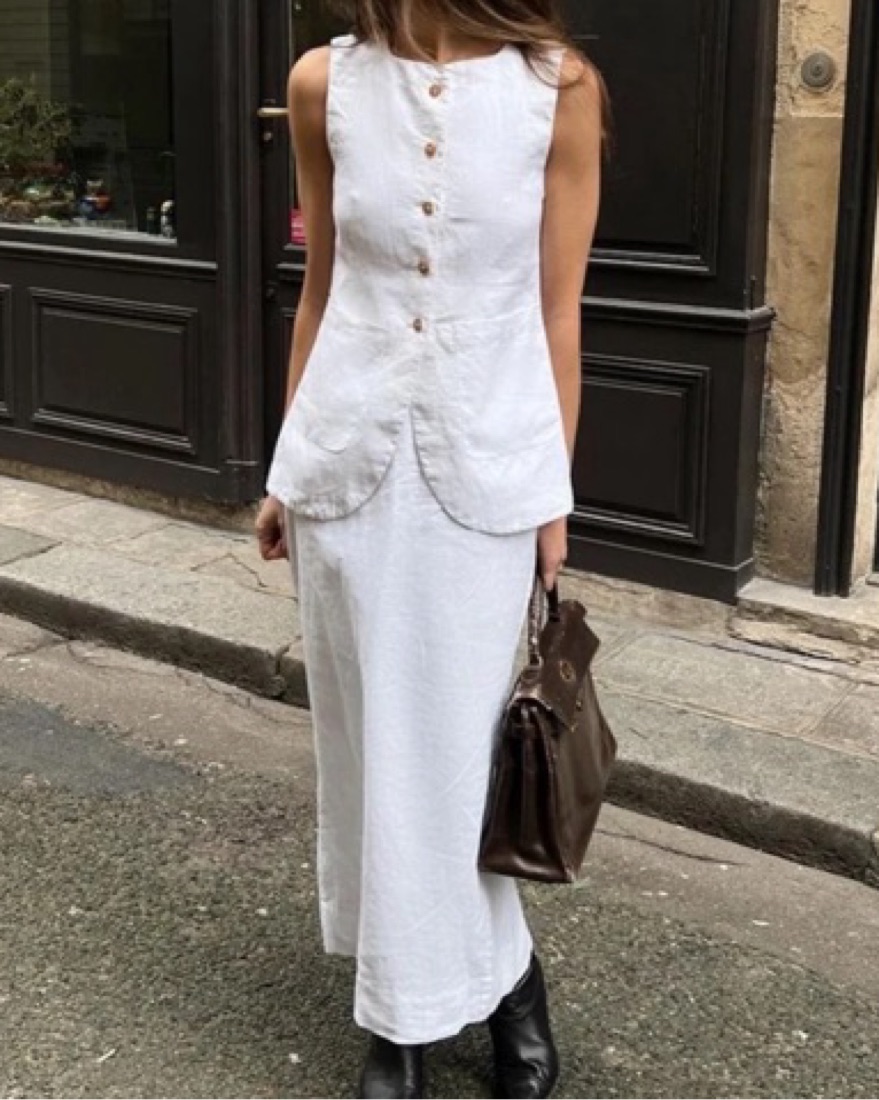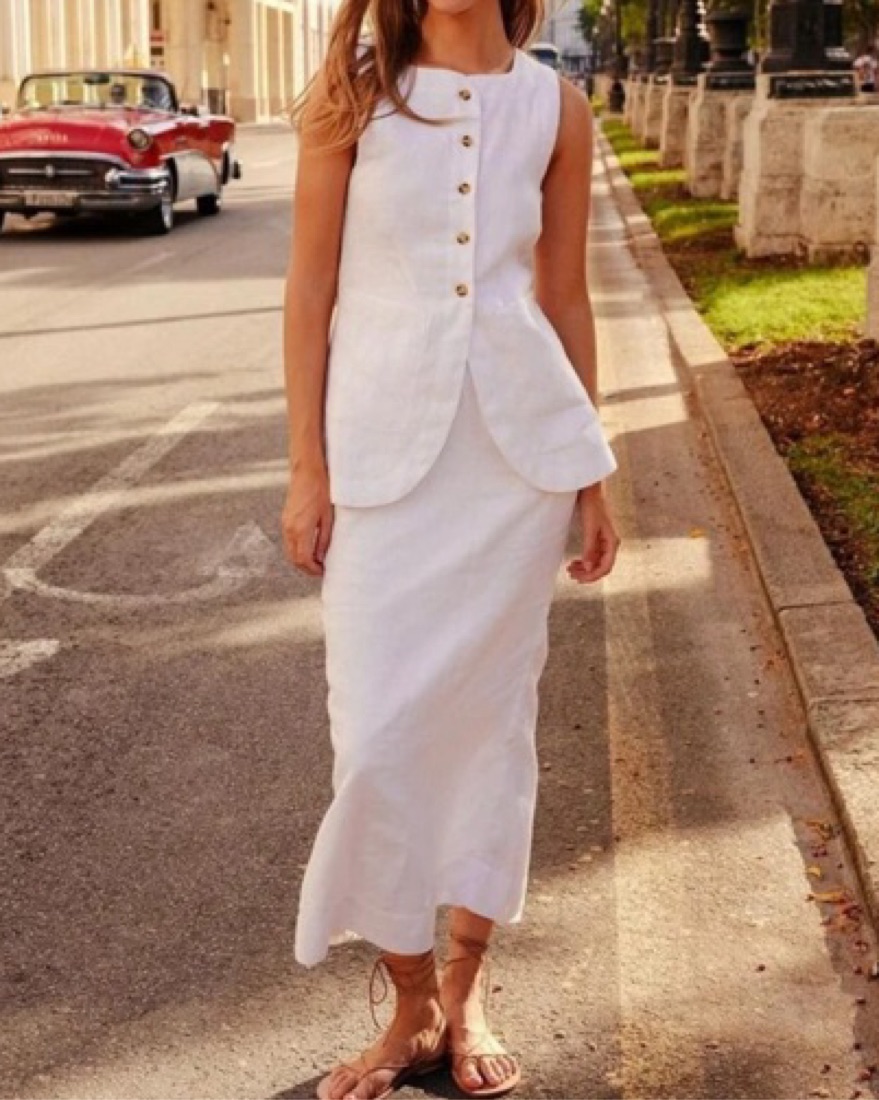 White Linen Skirt And Vest Set