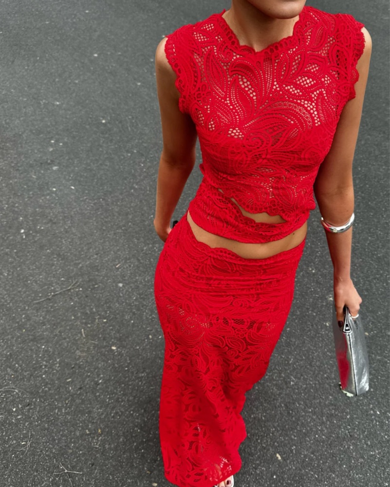Vibrant Red Lace Crop Top and Maxi Skirt Set