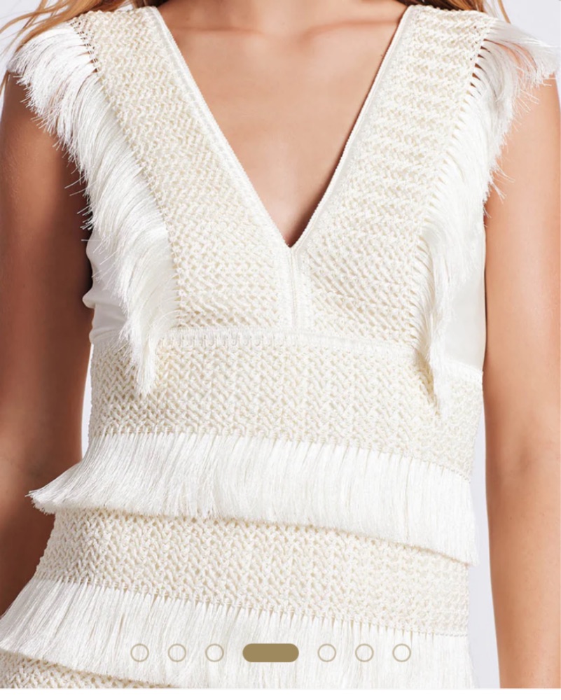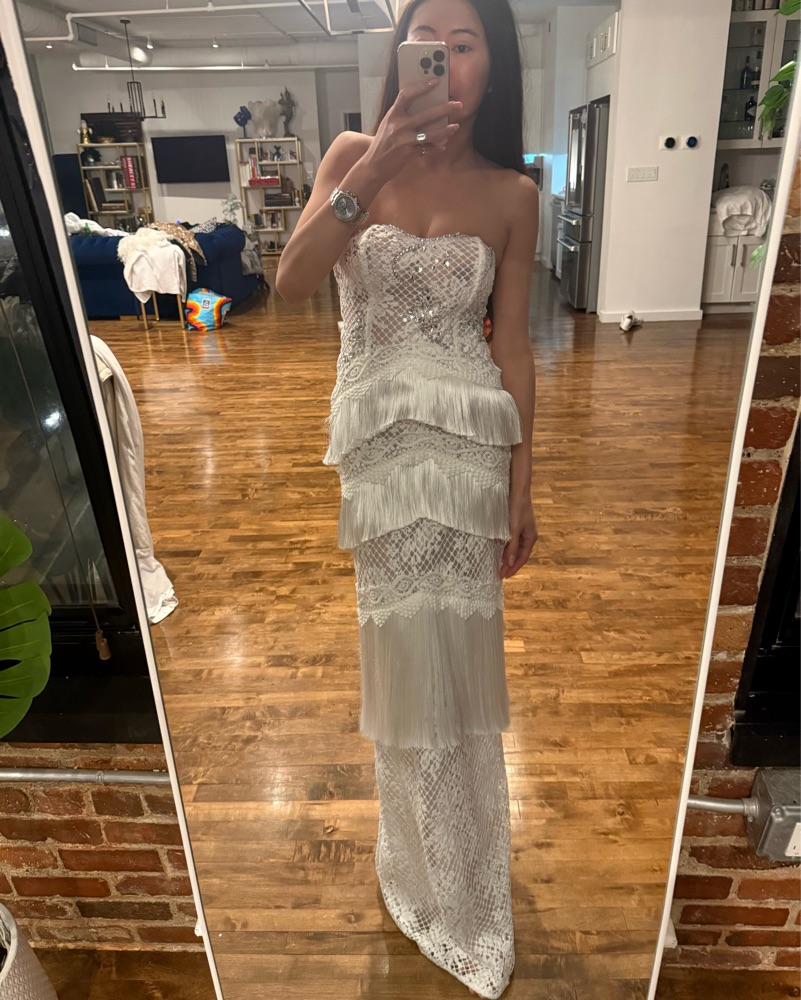 Patbo Beaded White Lace Fringe Gown XS