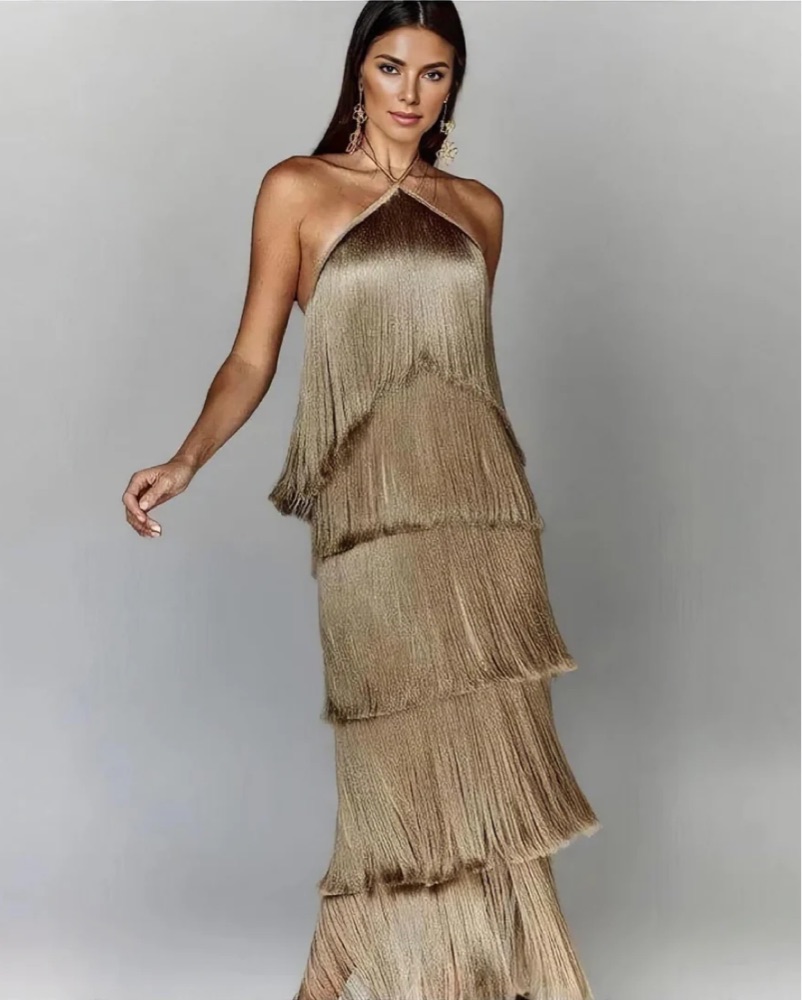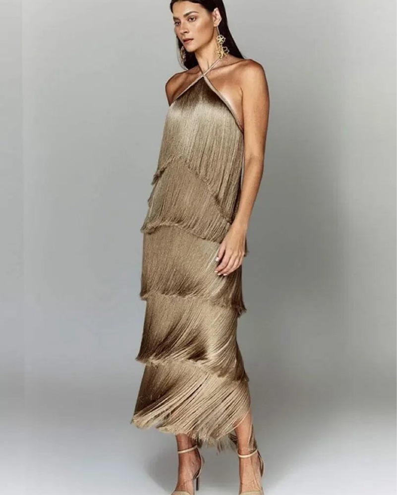 Gold Metallic Fringe Halter Maxi Dress