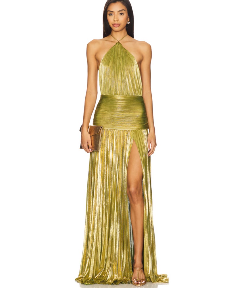 Brown Metallic Pleated Slit Gown